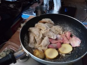 ギョーザ、ジャガイモ、砂肝、セセリ、メンチカツなどを、とにかくフライパンに乗せるだけ