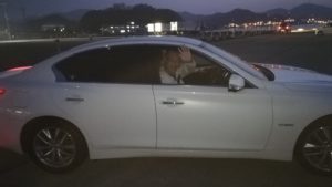 しばし青の1号の中で歓談し、薄暗くなった中、真っ白なスカイラインで颯爽と去っていきました。