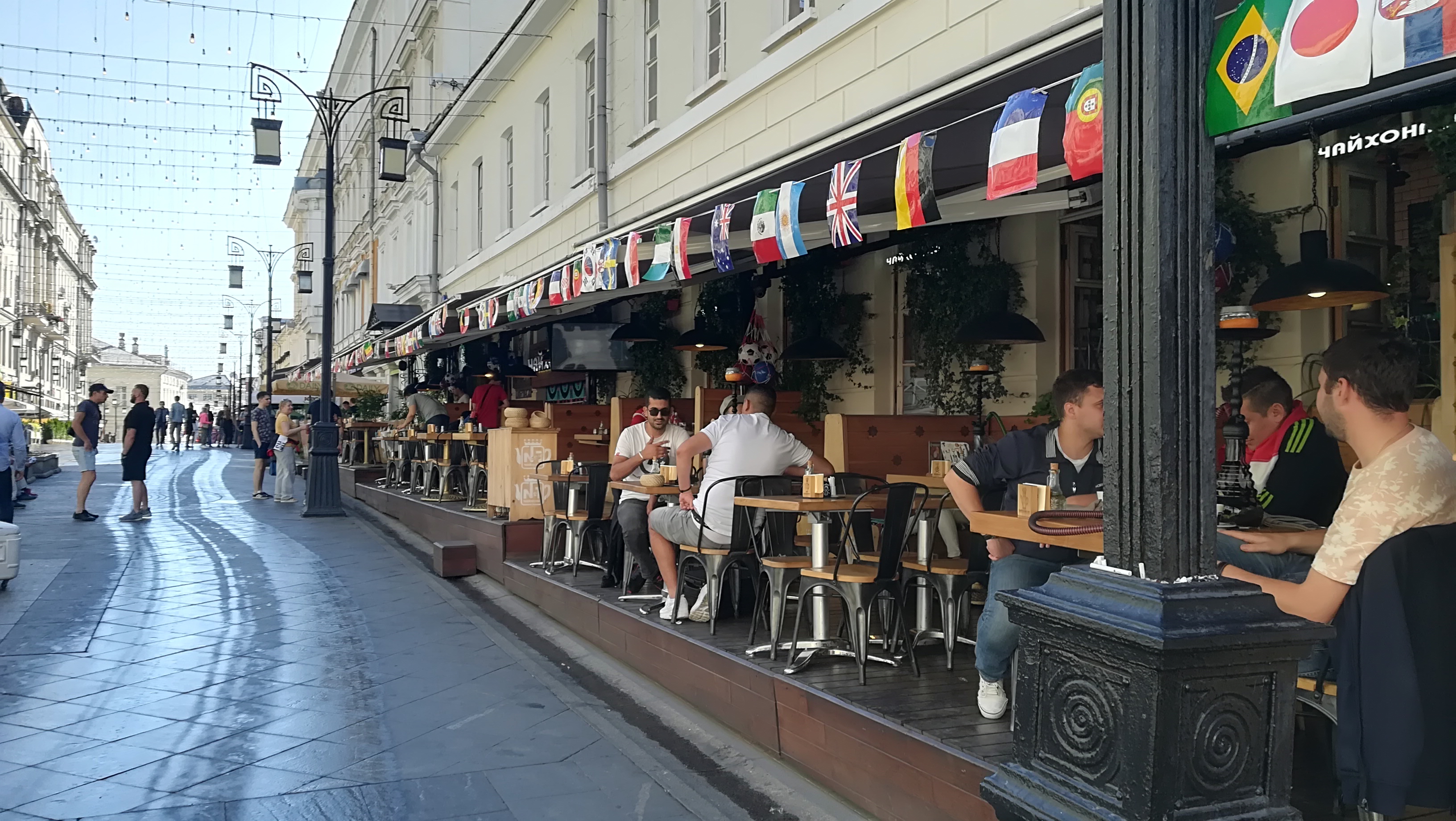 その後、あのいい雰囲気のオープンカフェで、行きゆく各国のサポーターを眺めながらビールを飲み