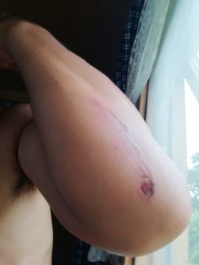 もう少し高いところからだったら、カラダの正面全部擦り剥いてるところでした。