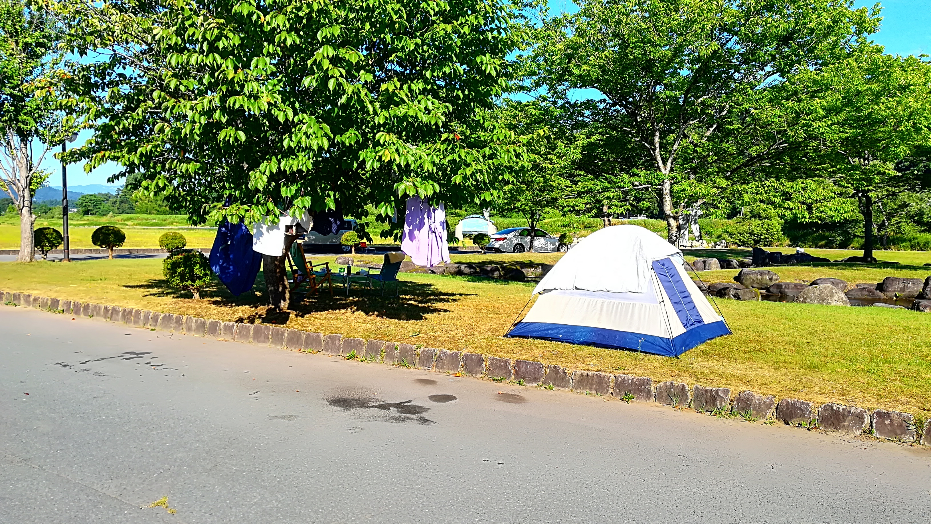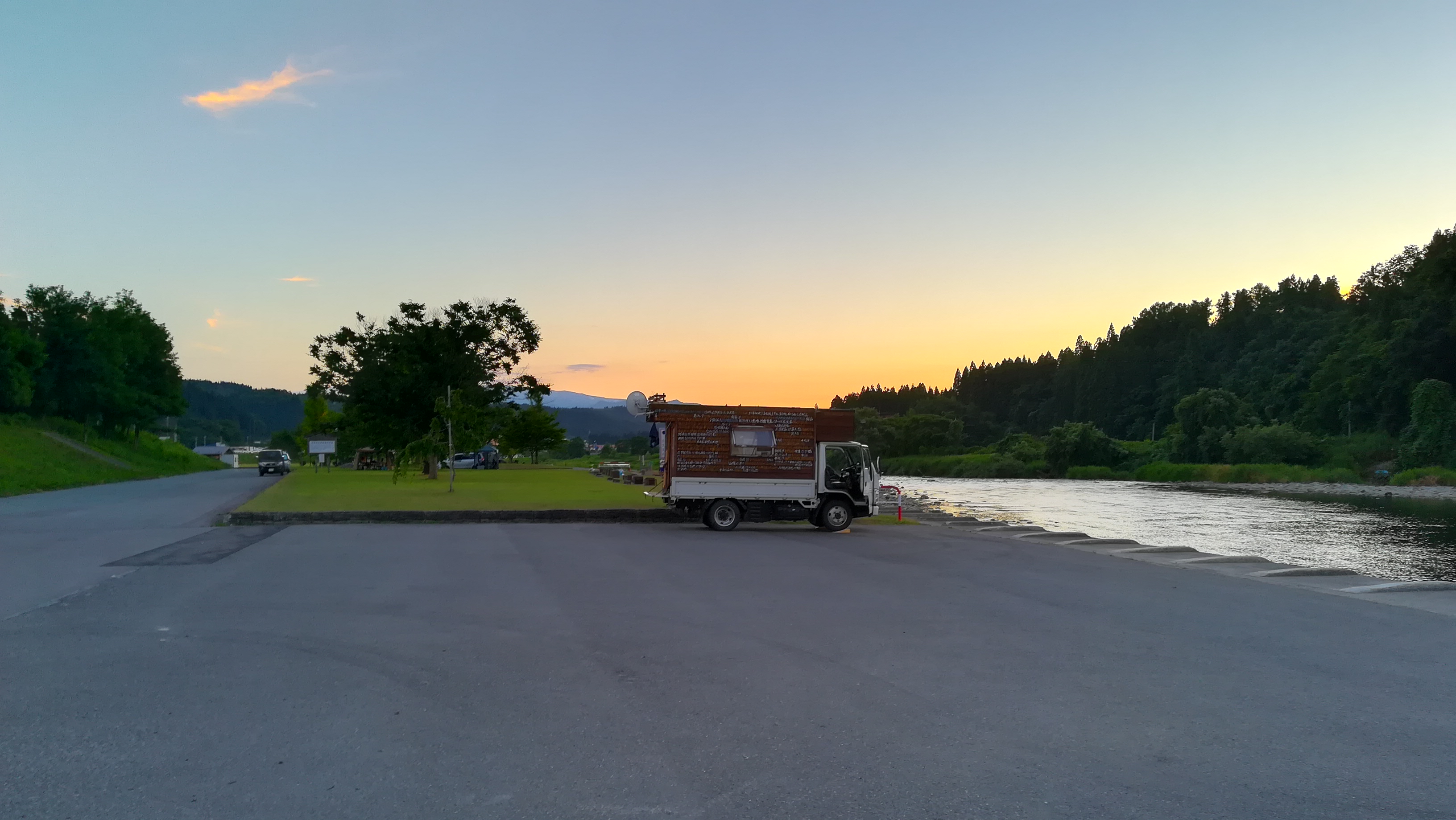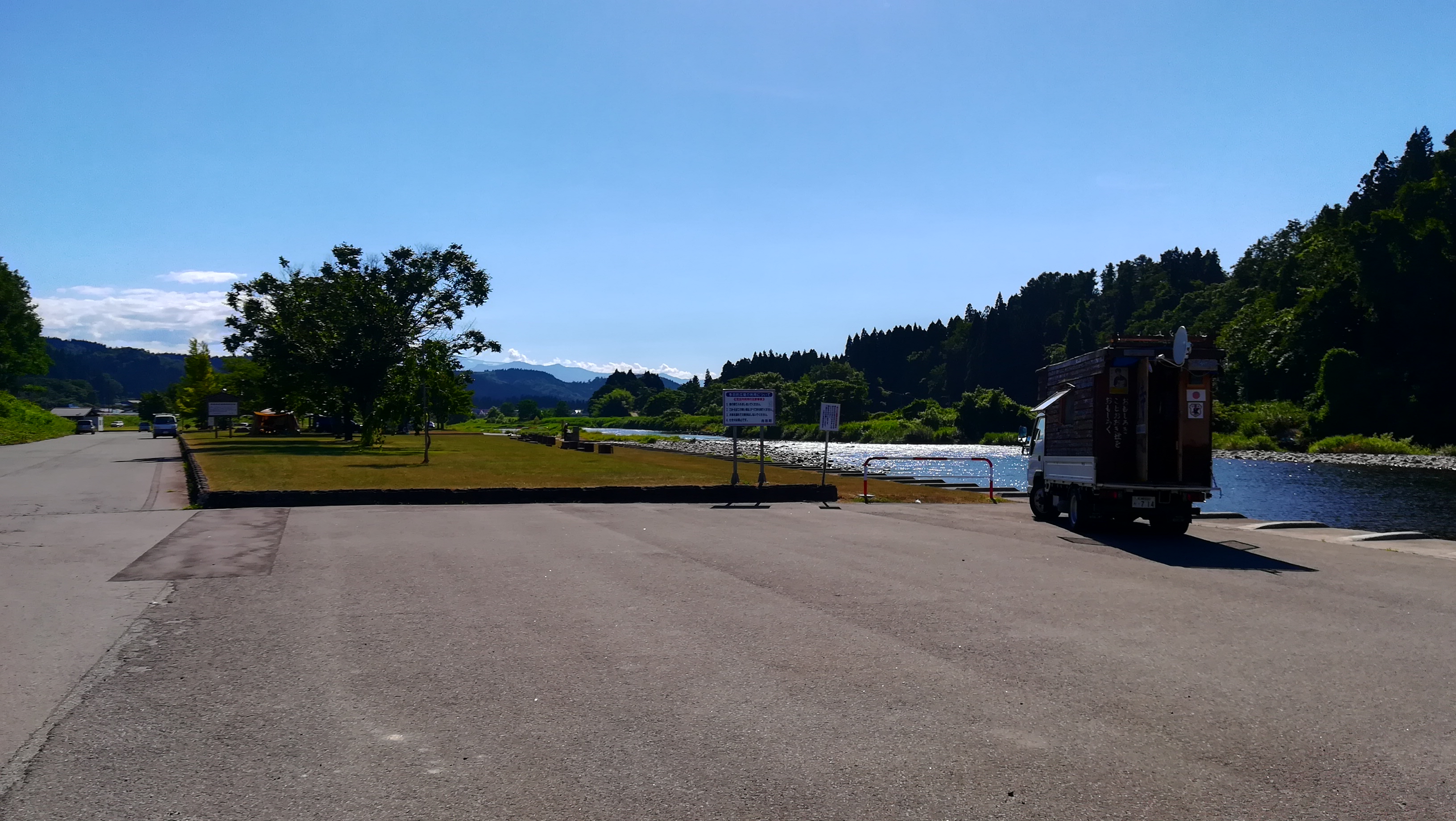 この小国川のほとりが広大な公園になっているのですが、皆さんのんびりここでキャンプなどをしながら楽しんでいます。