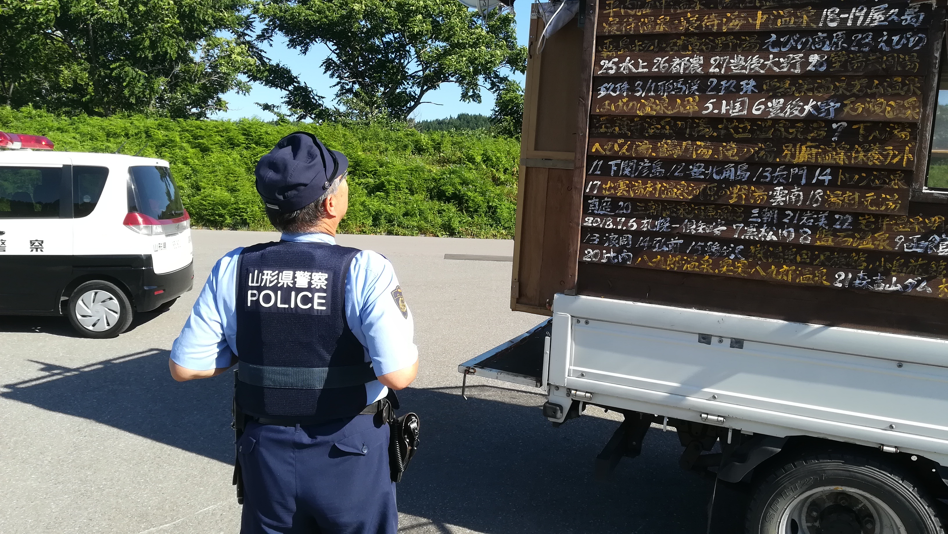 停まってしばらくすると、山形県警の文字を背負った男が車から出てきて、青の2号の周りをゆっくりと周り始めました。