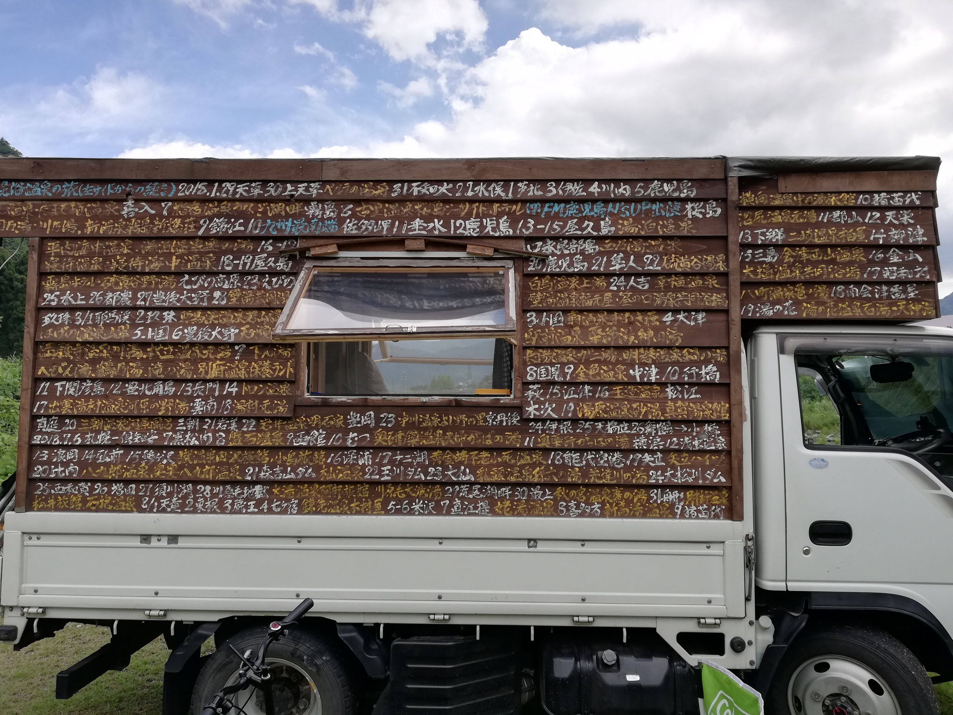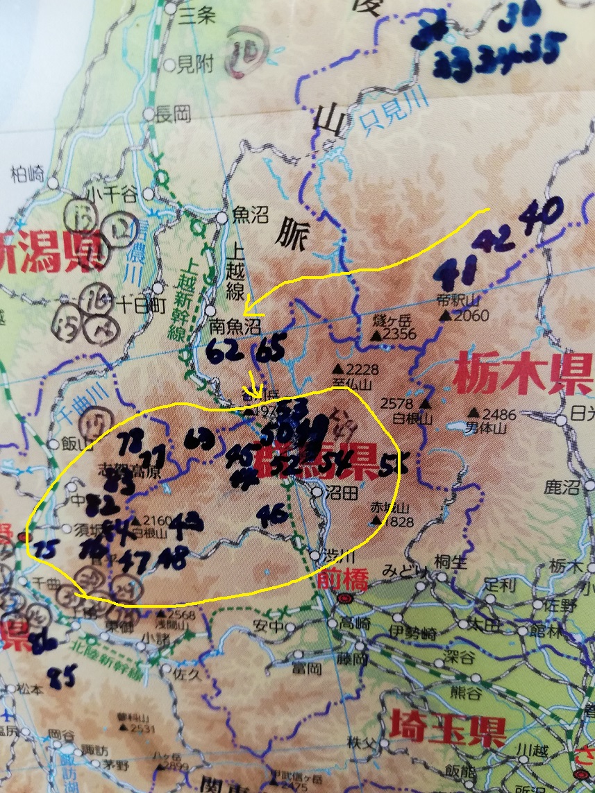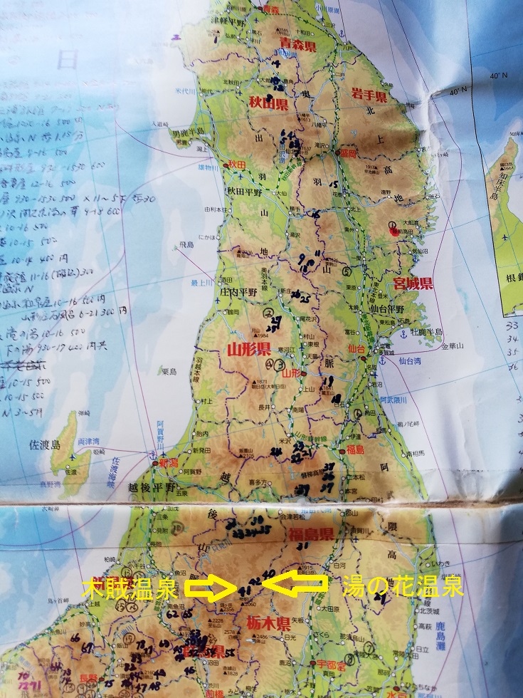 以前お見せしましたが、旅に出る前に日本地図に混浴温泉の位置を記したものを二日くらいで作成し、これを見ながらコースを決めているのですが