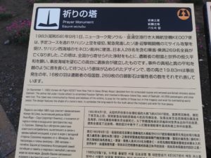1983年に旧ソ連のミサイル攻撃を受け撃墜された大韓航空機の遭難者の方々の慰霊と世界平和を願って建てられたこの祈りの塔の下で