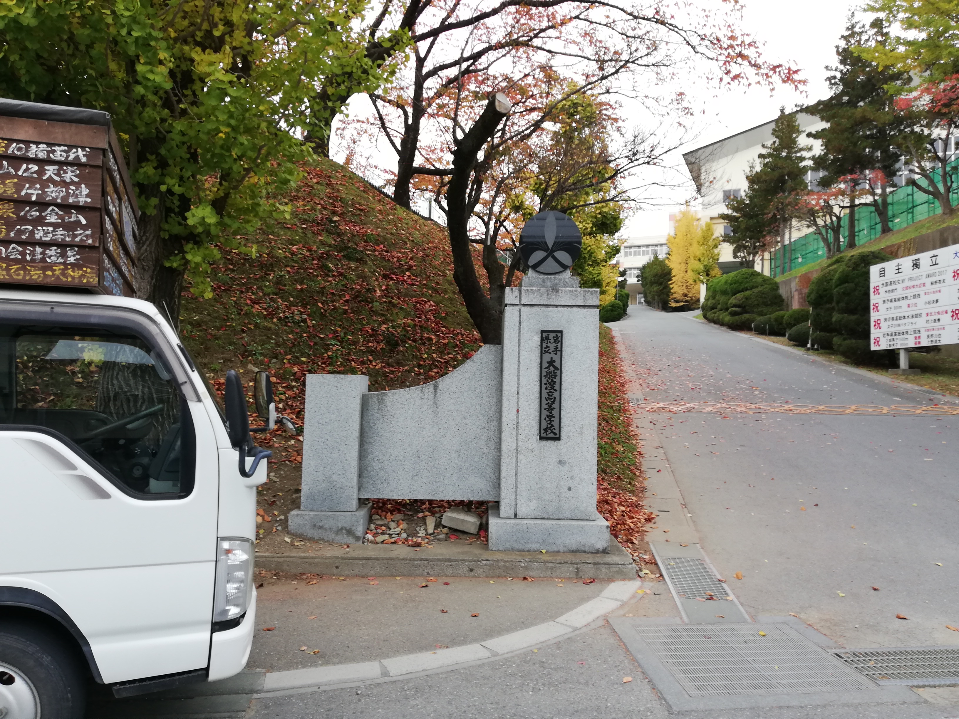 大船渡市街に入り、高校時代からファンだった小笠原みっちー(鹿島アントラーズ)の母校、大船渡高校の前で記念撮影し、
