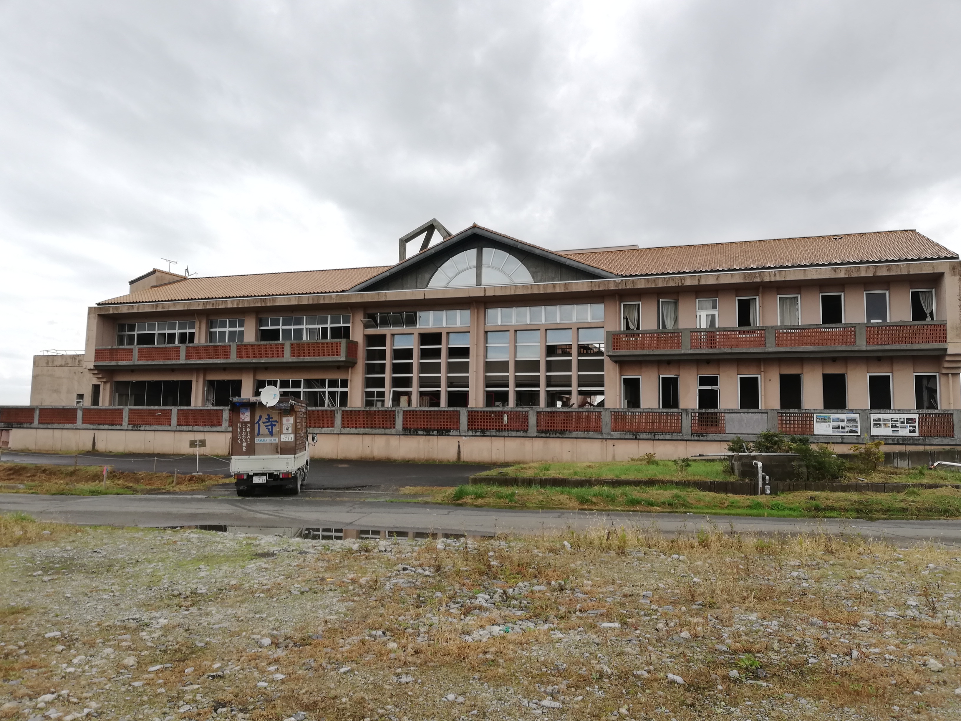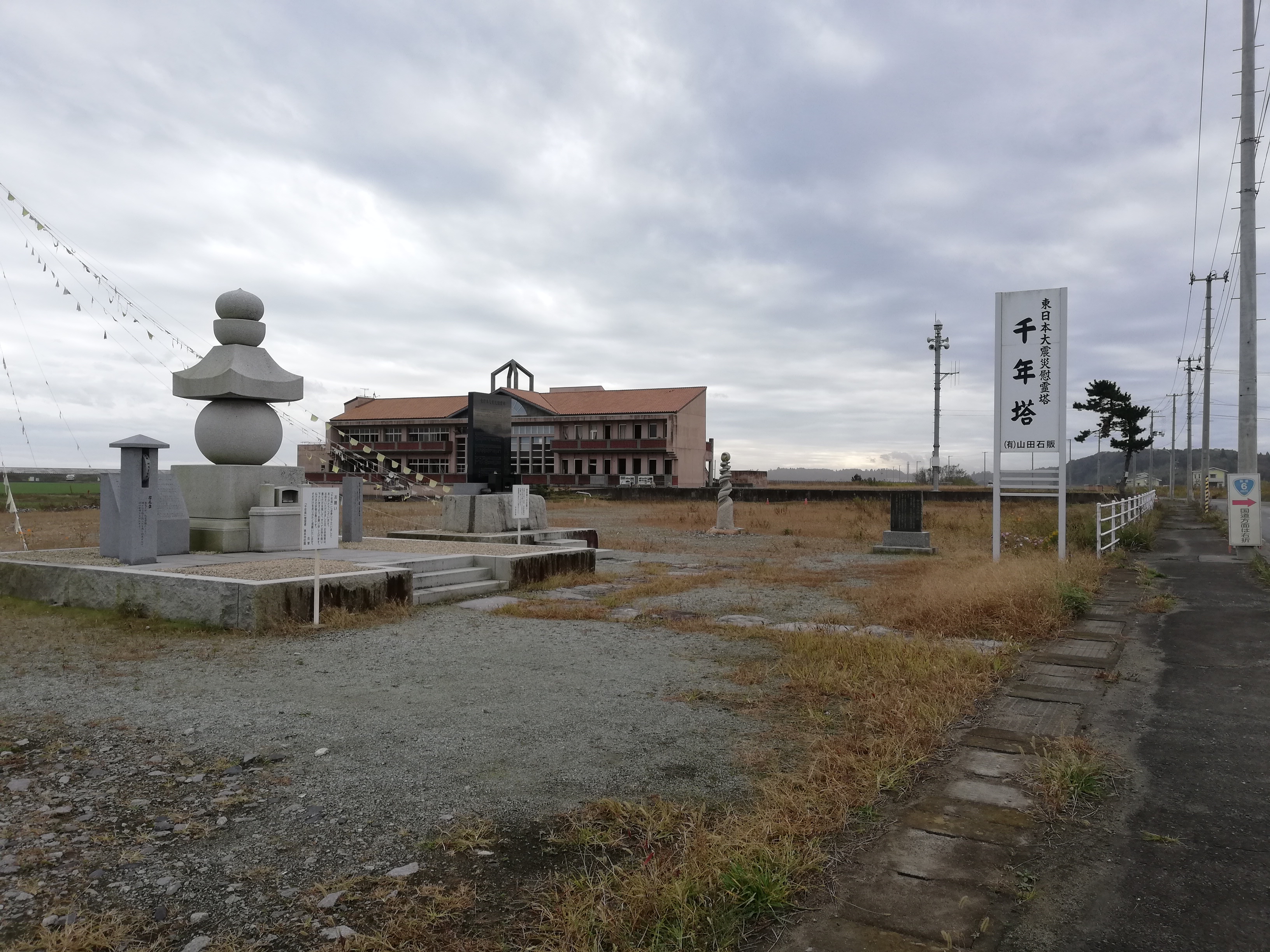 千年塔という案内板の向こうに、震災で被災したらしい建物があります。