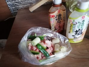鶏肉をハサミで切ってビニール袋の中にピーマンと長ネギと一緒に入れて、焼き肉のタレを流し込んでぐじゅぐじゅと揉んで冷蔵庫の中に入れとけば、後は焼くだけです。