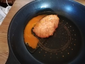 まずは、フライパンの端の方にコロッケorハンバーグorメンチカツを乗せて生タマゴを落とし、