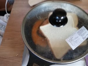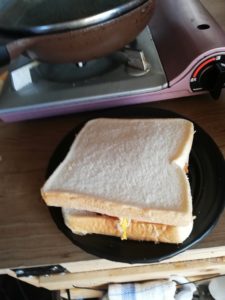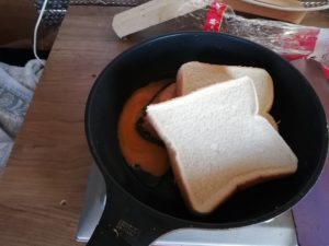 タマゴが焼けた頃に、下の食パンを皿の上に乗せて