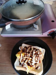 コロッケ&タマゴをその上に乗せてマヨネーズとソースをお好み焼き風に掛けます。