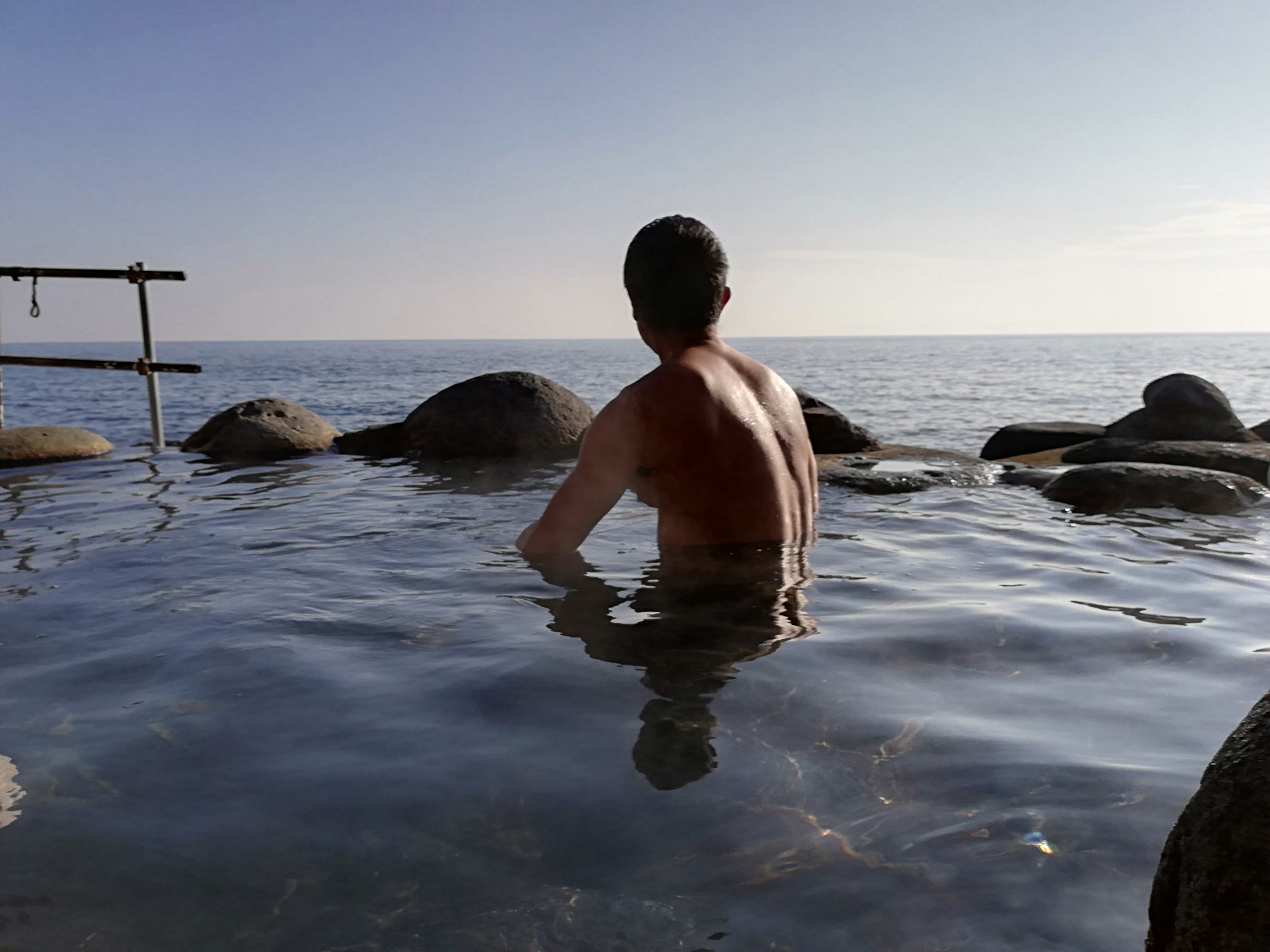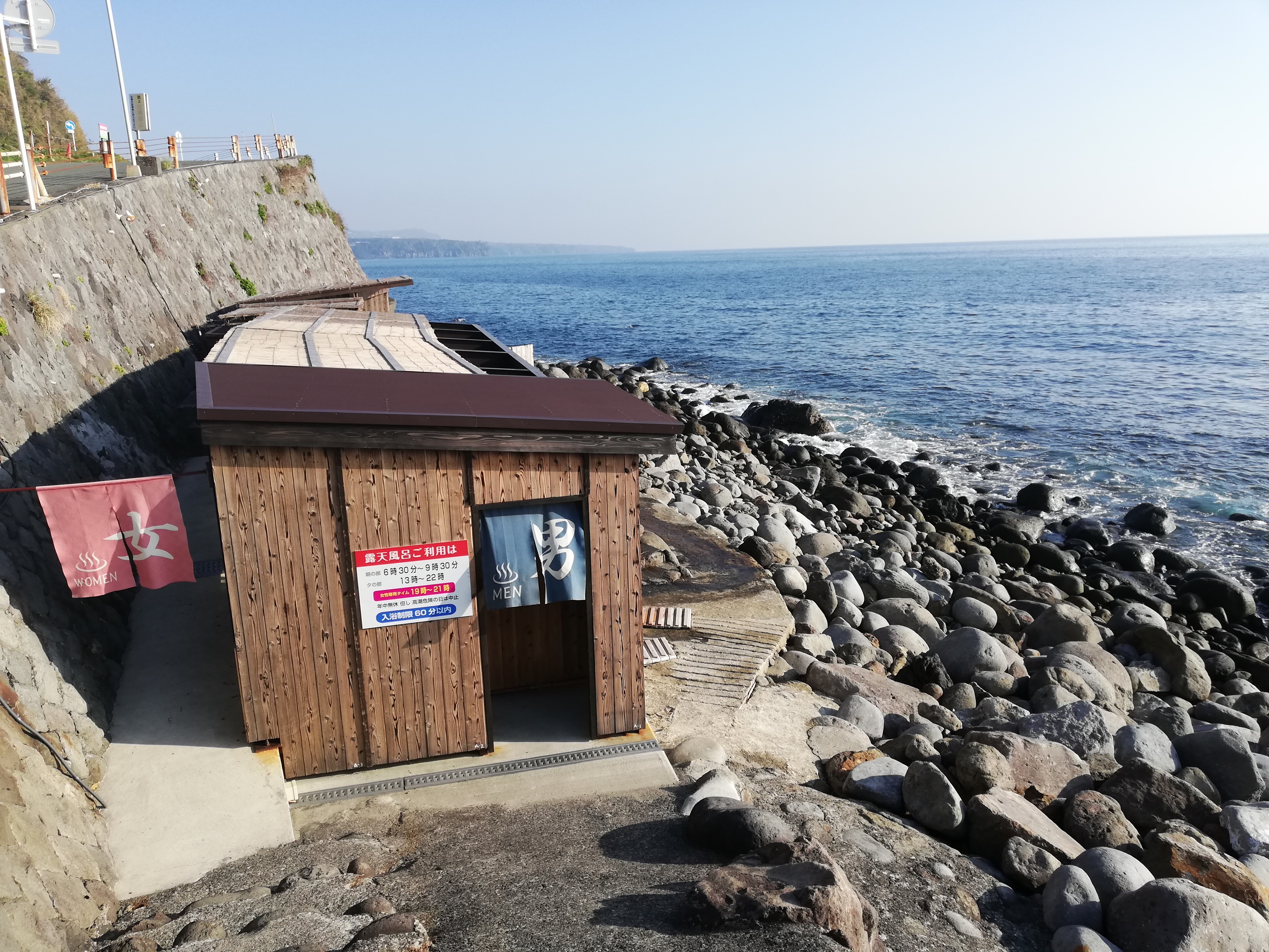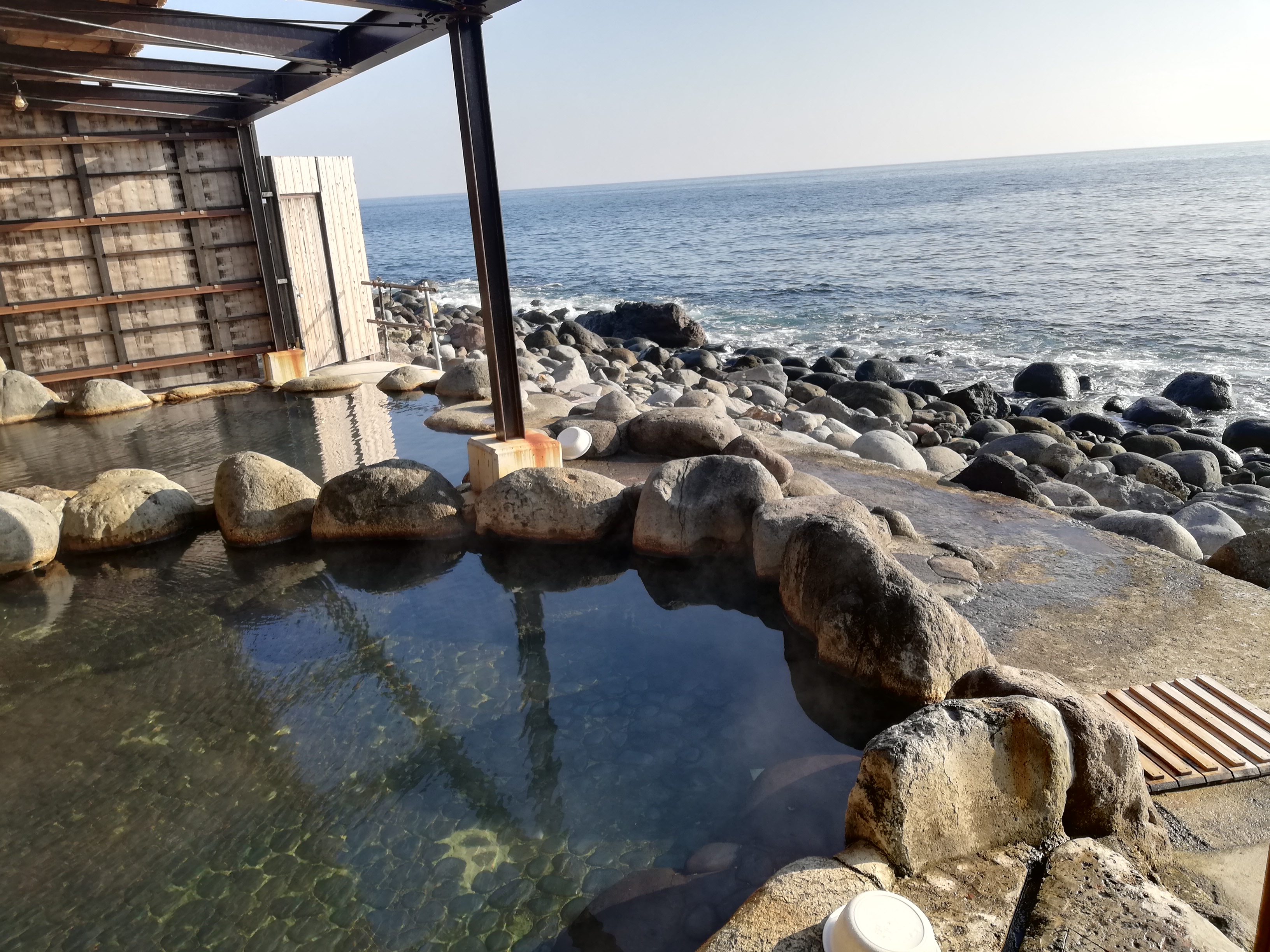 東伊豆の名物混浴露天風呂の北川(ほっかわ)温泉黒根岩風呂です。