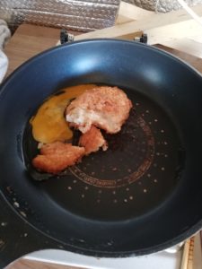 フライパンにコロッケとタマゴを落とし、
