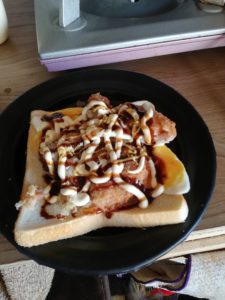 パンの上にコロッケ&タマゴを乗せ、マヨネーズとソースとマスタードをお好み焼きのようにかけて、