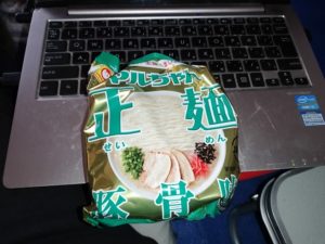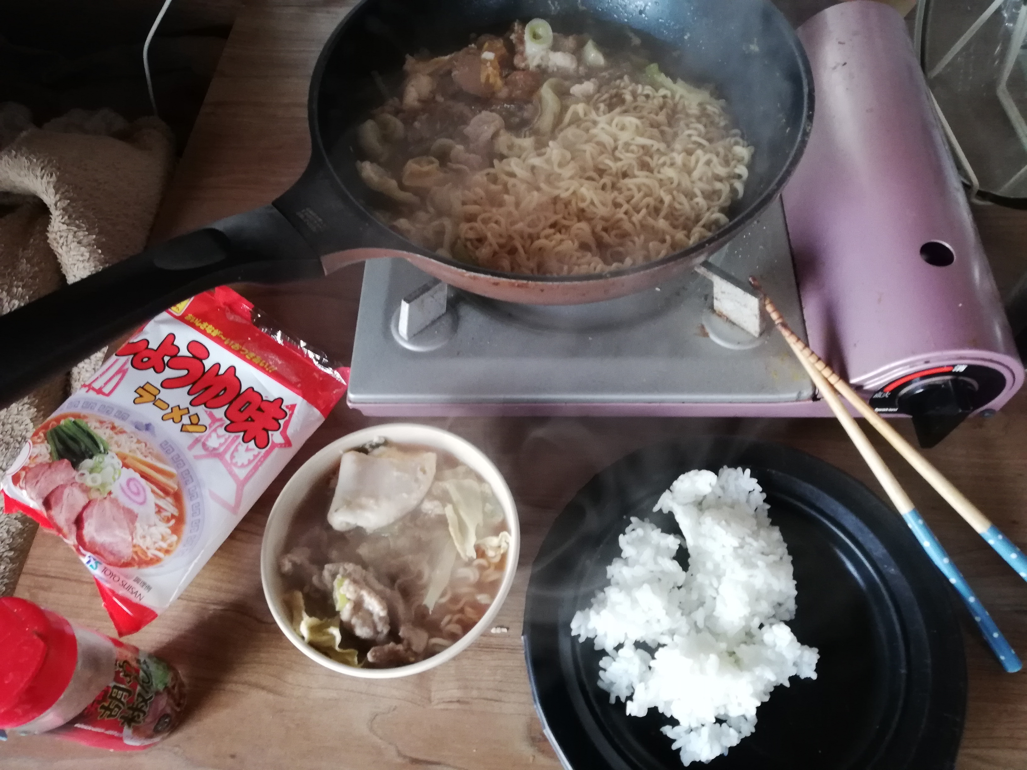 水を2杯半(←うどんでは2杯です)入れたフライパンにいつも通り、豚肉、長ネギ、キャベツ、タマゴを入れて煮立て、麺を投入し3分で、はい、しょうゆ味のラーメンライスの出来上がりです。