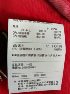 出光のまいどカードで支払ったせいか、さらに値引きされて98円/Lです。