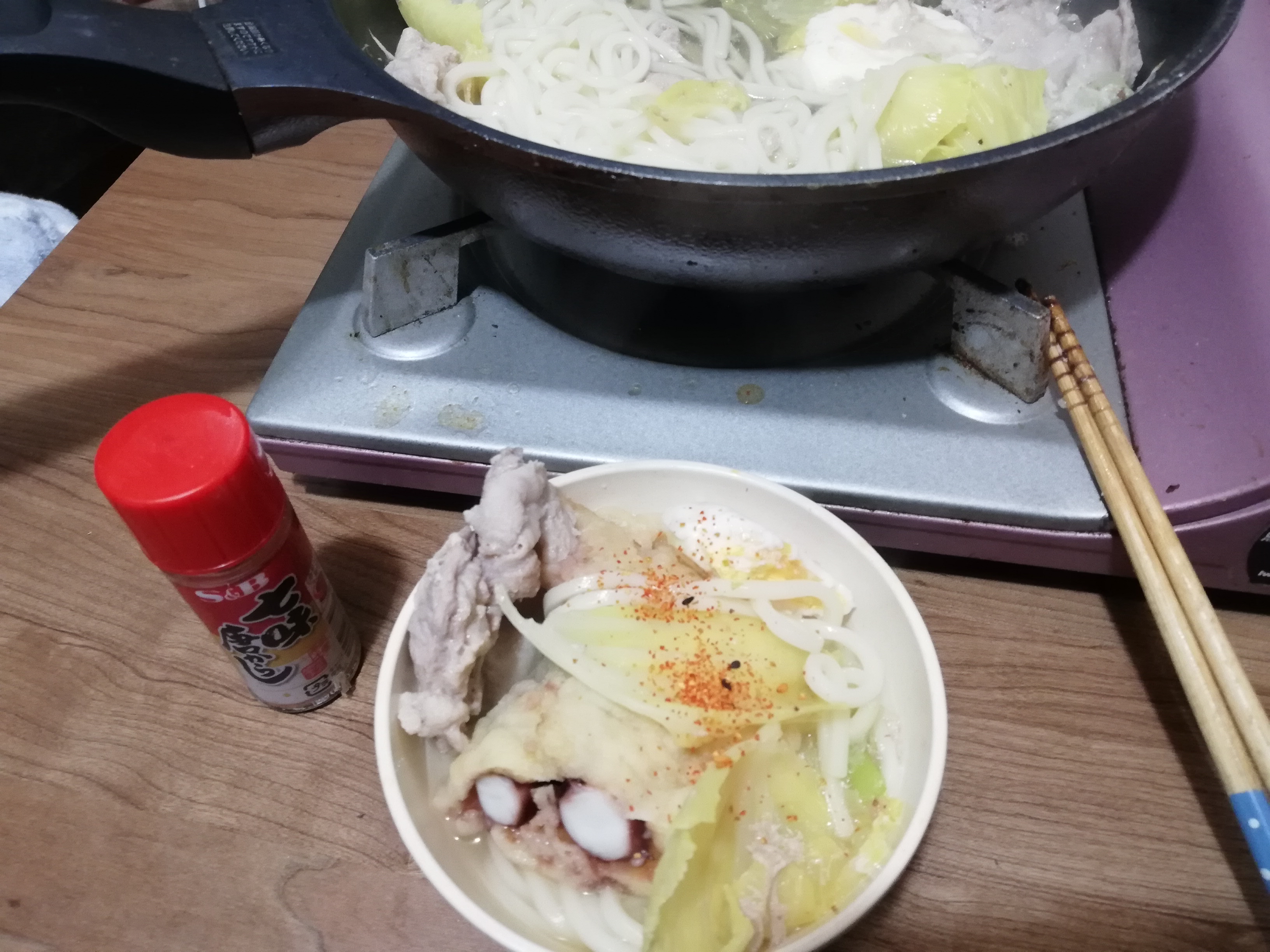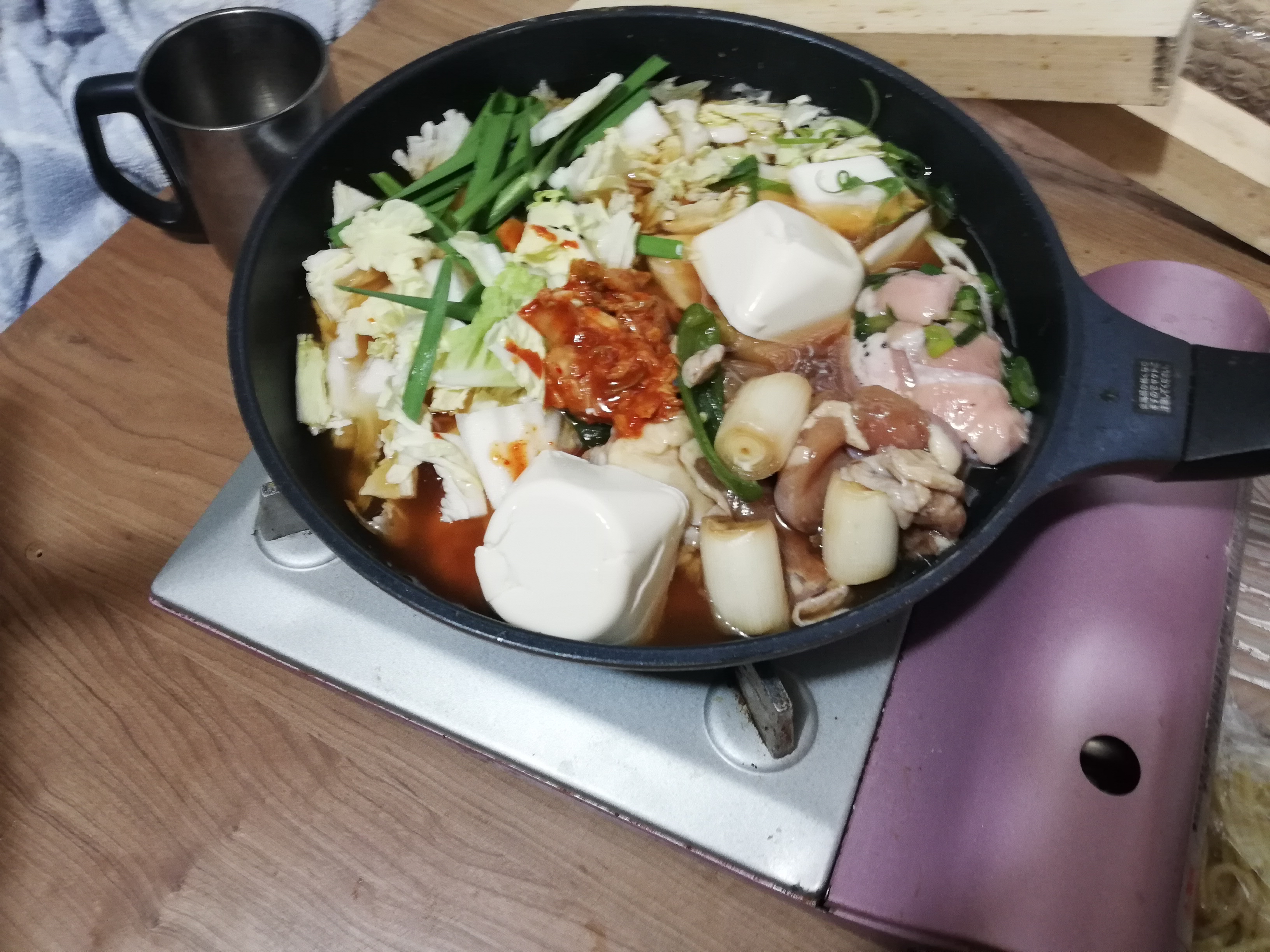 サンバーTさんが買ってきてくれた具材と冷蔵庫の中の具材をとにかく放り込んで、ちゃんこ鍋の素とキムチ鍋の素の合わせ味スープでぐつぐつ煮れば出来上がりです。