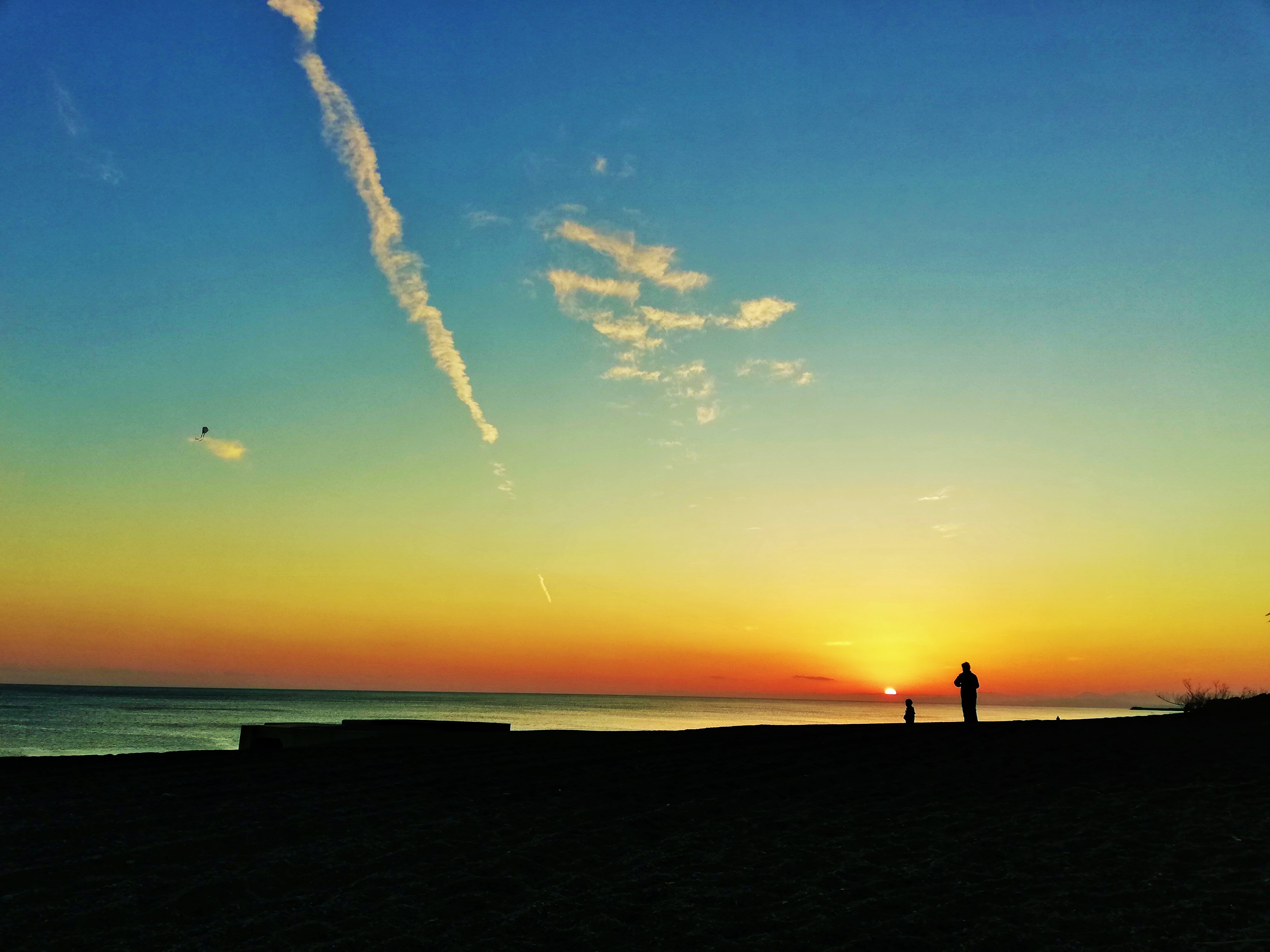 夕暮れ時に浜辺に下りてみると、親子が凧揚げをしています。