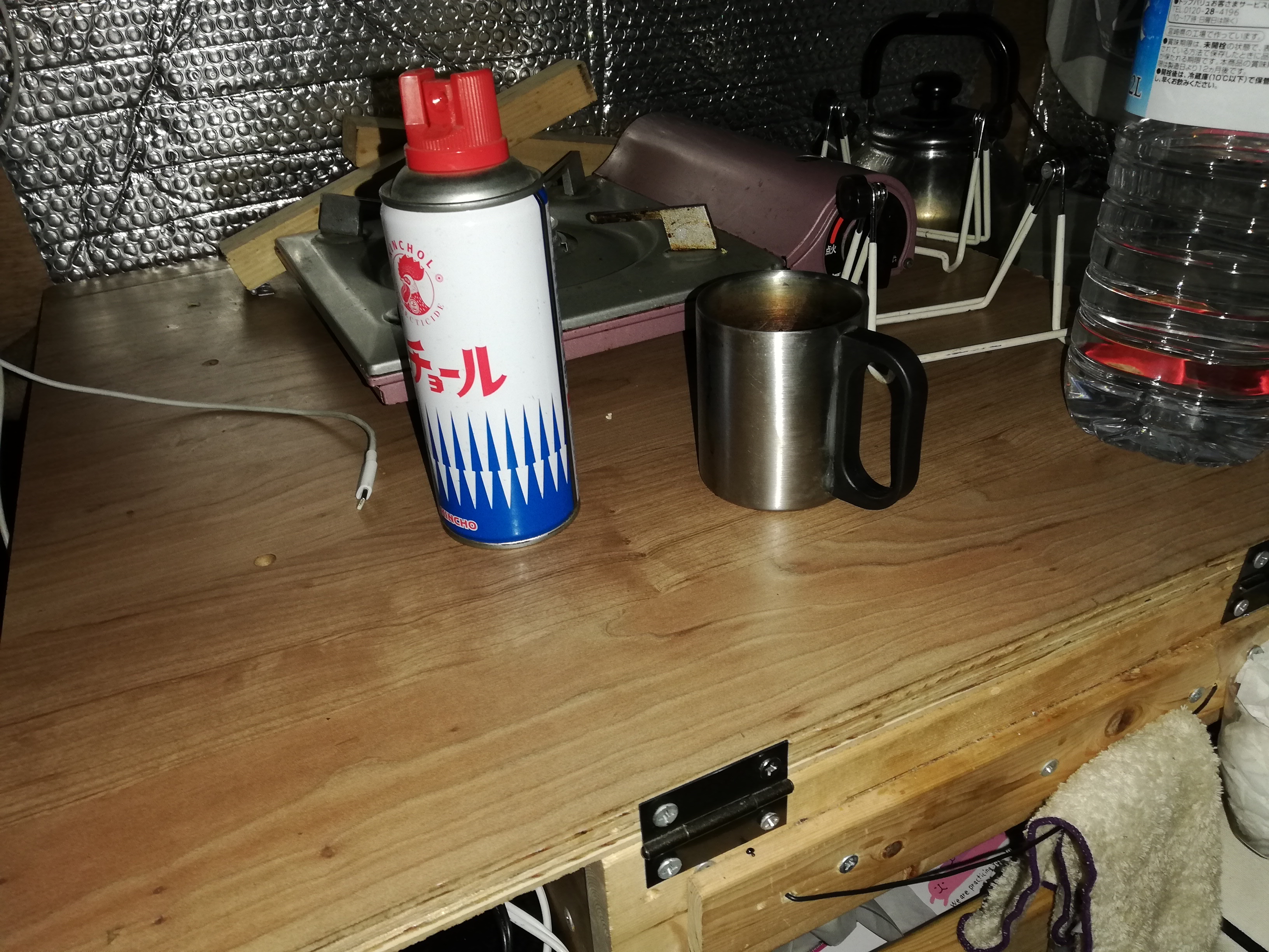 寝る前にコーヒー用のマグカップに水を入れておいて、深夜の暗がりでも手を伸ばせばすぐに水を飲めるようにしてあるのですよ。