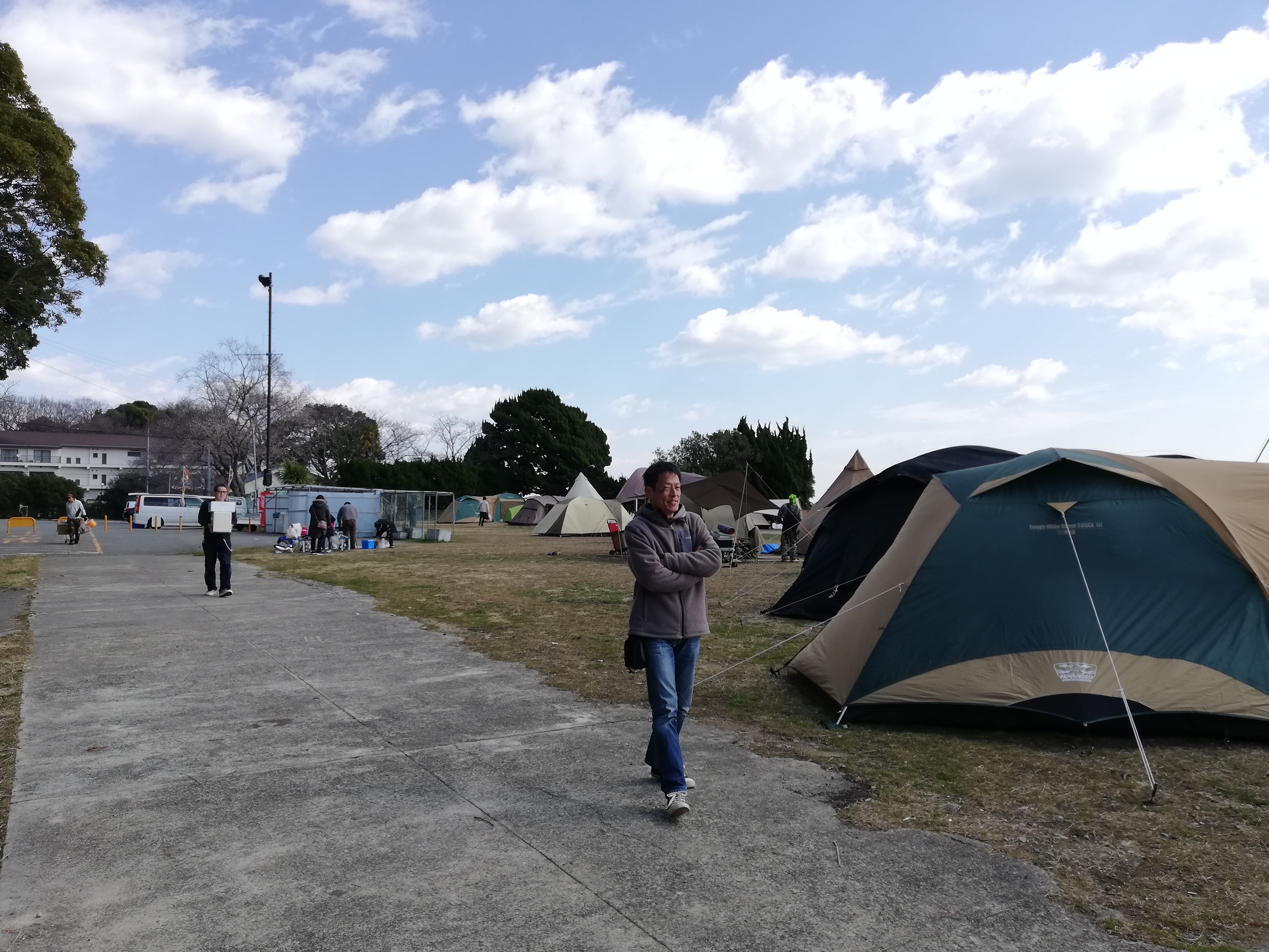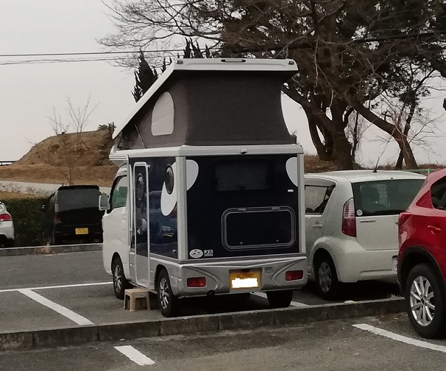 以前車を見かけたのは熊本県人吉市の中川原公園(川の中洲)駐車場で、目の前に止まってるDIYのトラック(キャンピングカー青の1号)でした(笑)