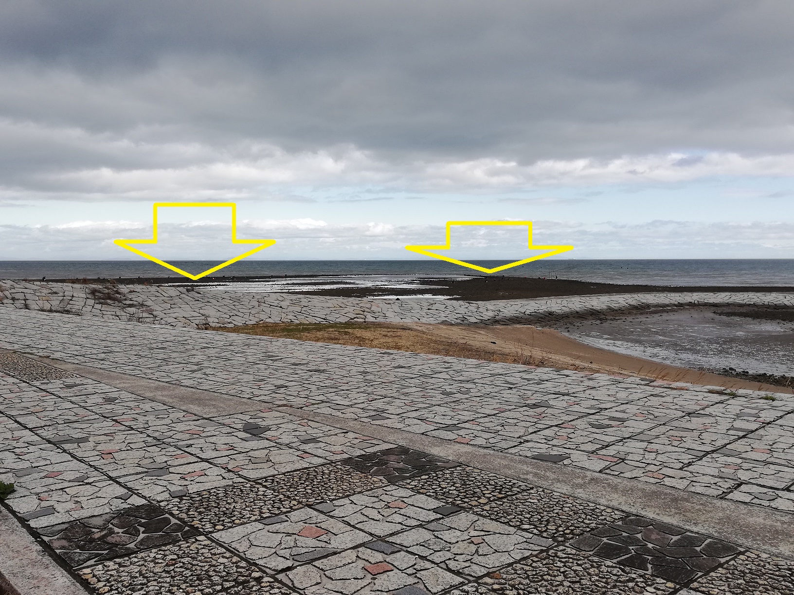 堤防に上がってみると、向こうの波打ち際にパラパラとヒトの姿が見えます。