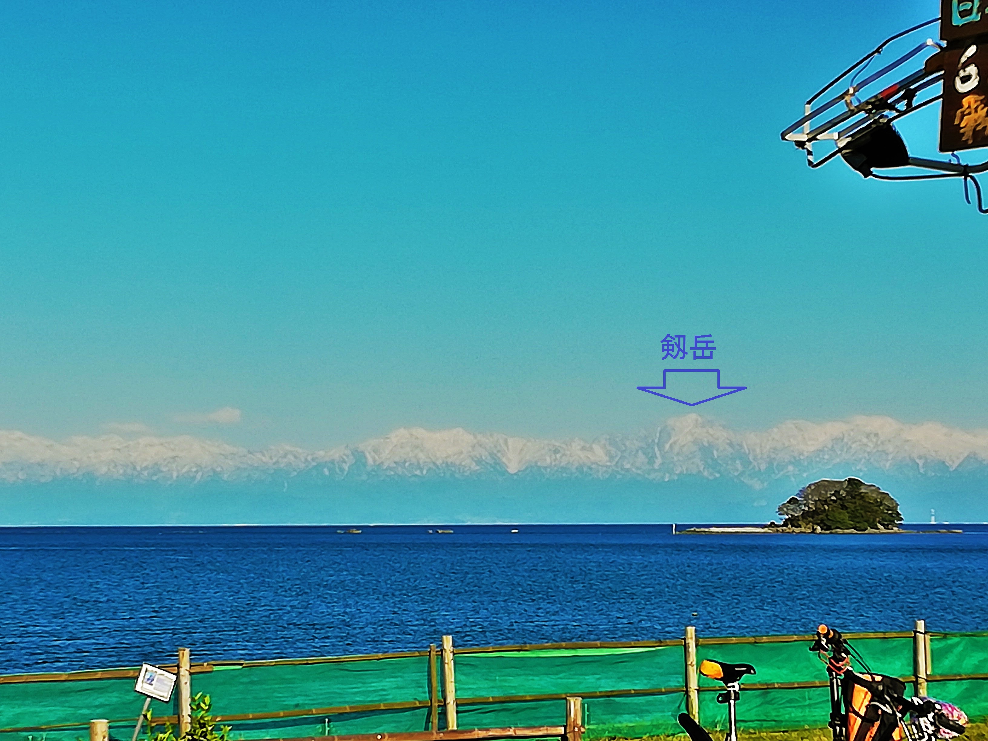 雪をたっぷり被った立山連峰が日本海の向こうに浮かんでいます。