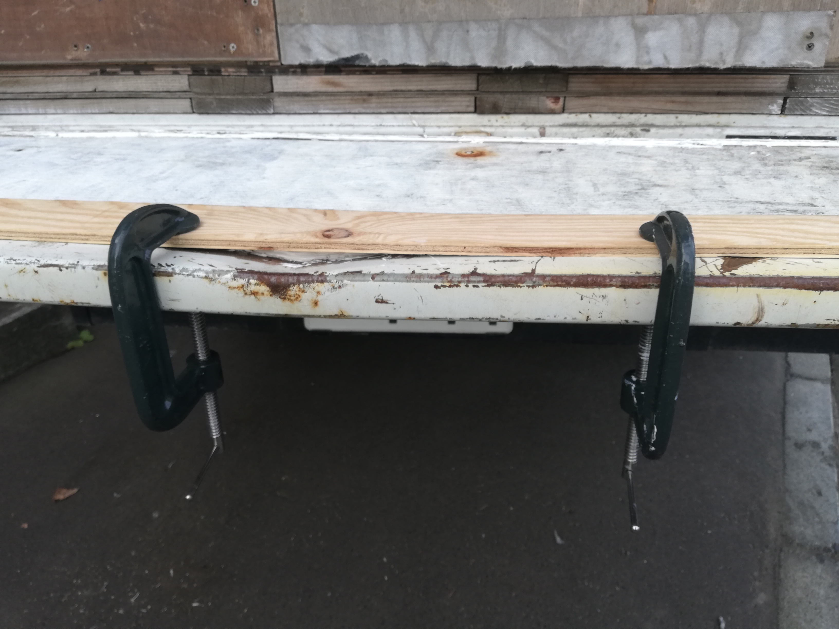 この隙間にシリコン剤をたっぷり注入して、上に板を乗せてクランプで押さえつけます。