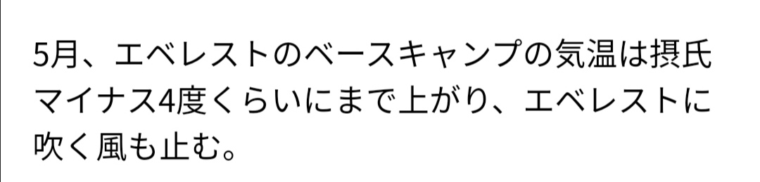 冬はわからないけどベースキャンプの4,5月の気温は-10℃にもならないようです。