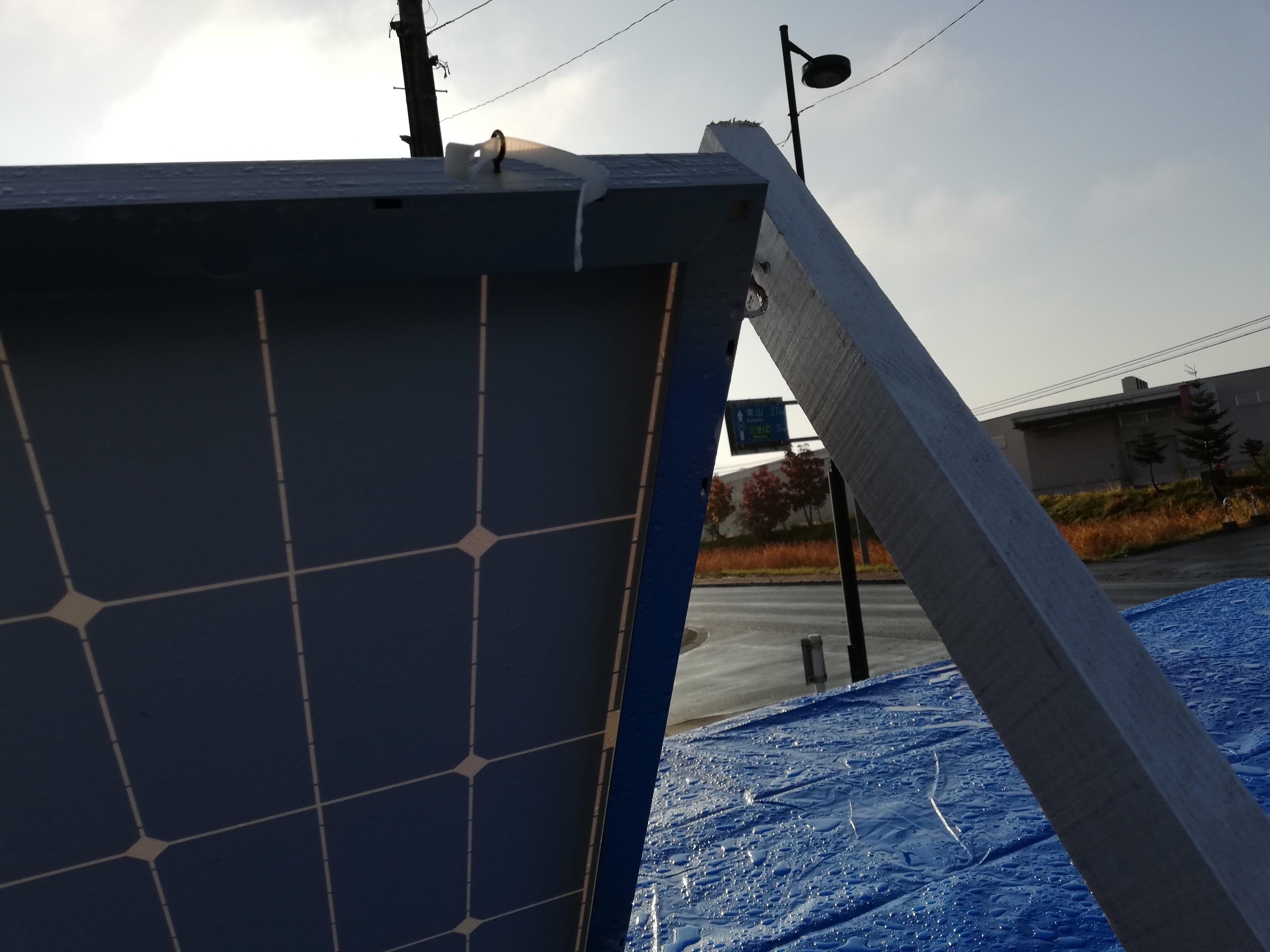 梯子で屋根に登り、可動式ソーラーパネルを立てます。
