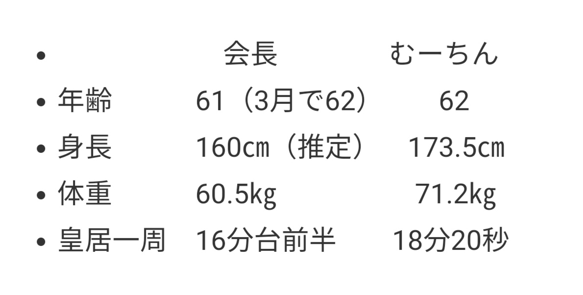 僕の皇居一周の数字は40年以上前の学生時代のものですが、会長のもたぶん若かりし時のものだと思います。