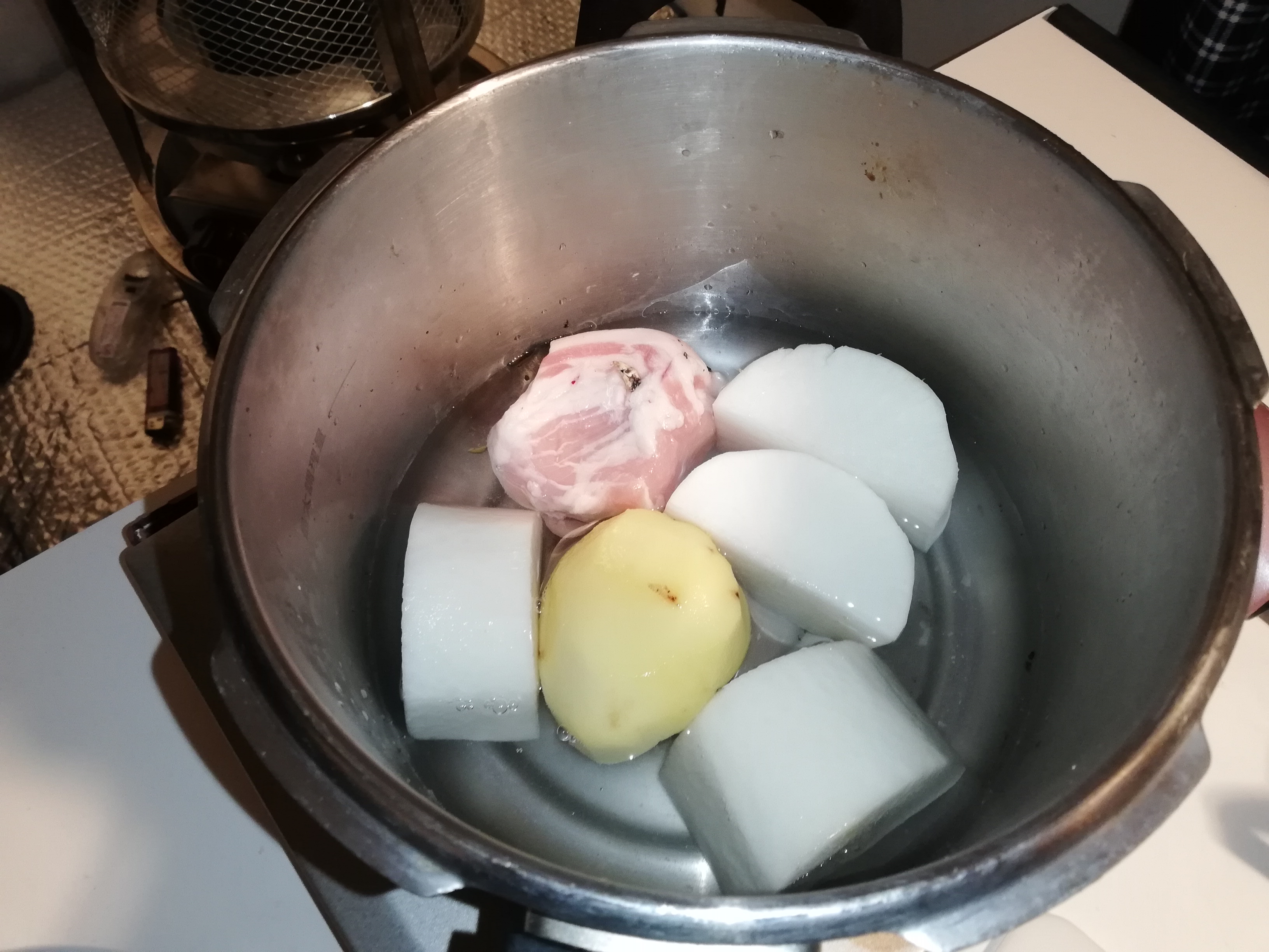 圧力鍋にじゃがいも、大根、豚肉ブロックを入れて