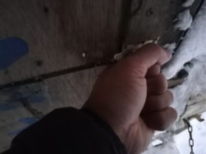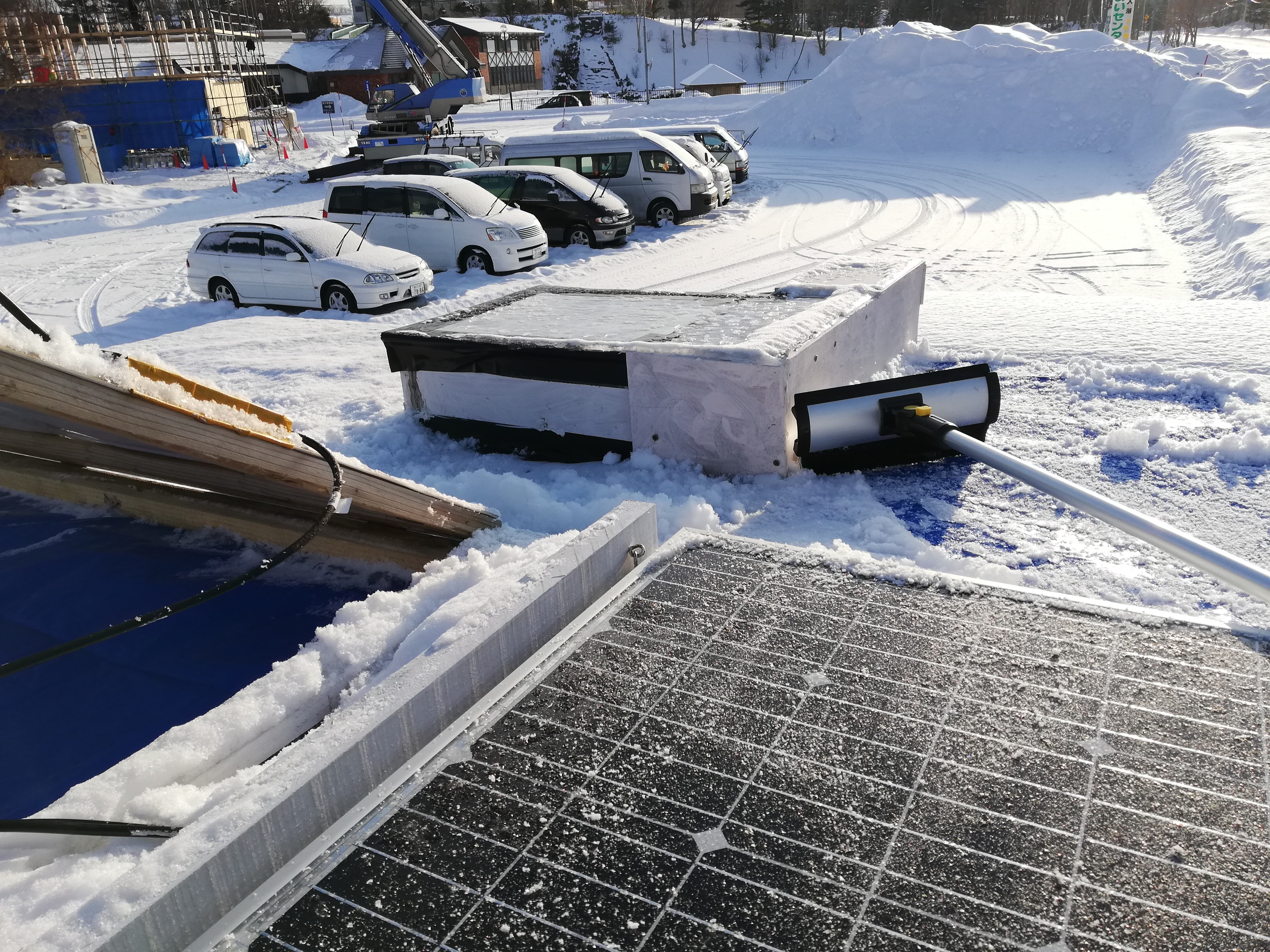 屋根にうっすらと積もった雪を落として、ソーラーを立てます。