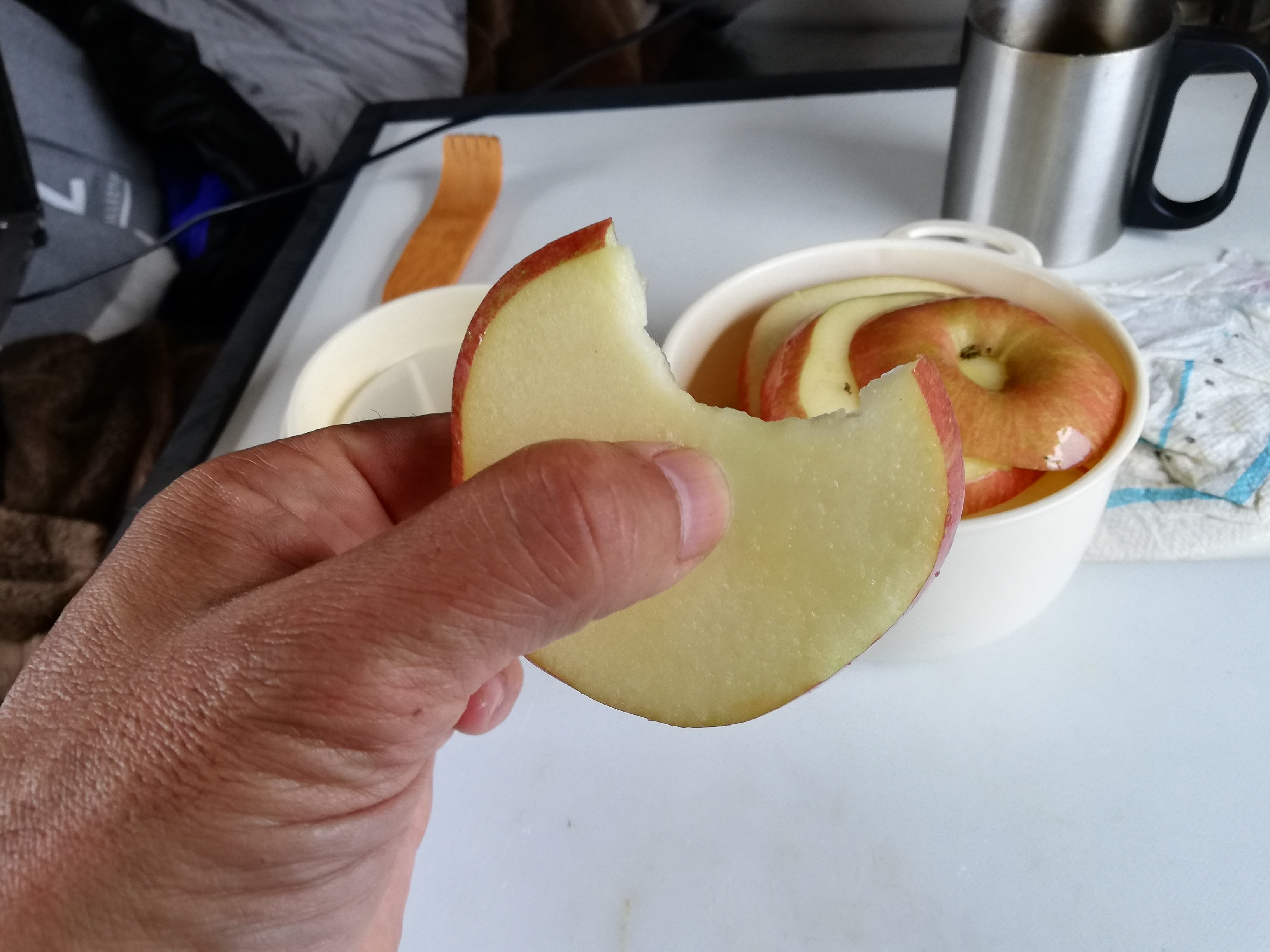 紋別のイオンで買ってきたリンゴをテーブルの上に置き、