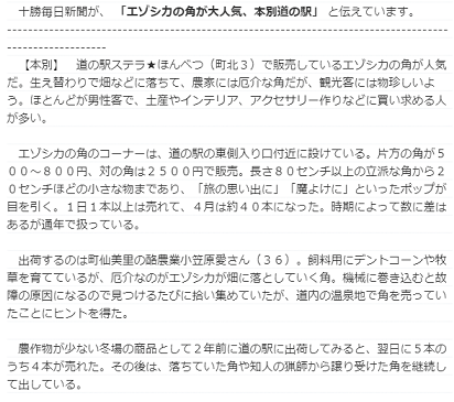 町内の酪農業を営む方が、畑に落ちてる鹿の角の処理に困って道の駅に5本置いてみたら、なんと翌日に4本売れたそうなのです。