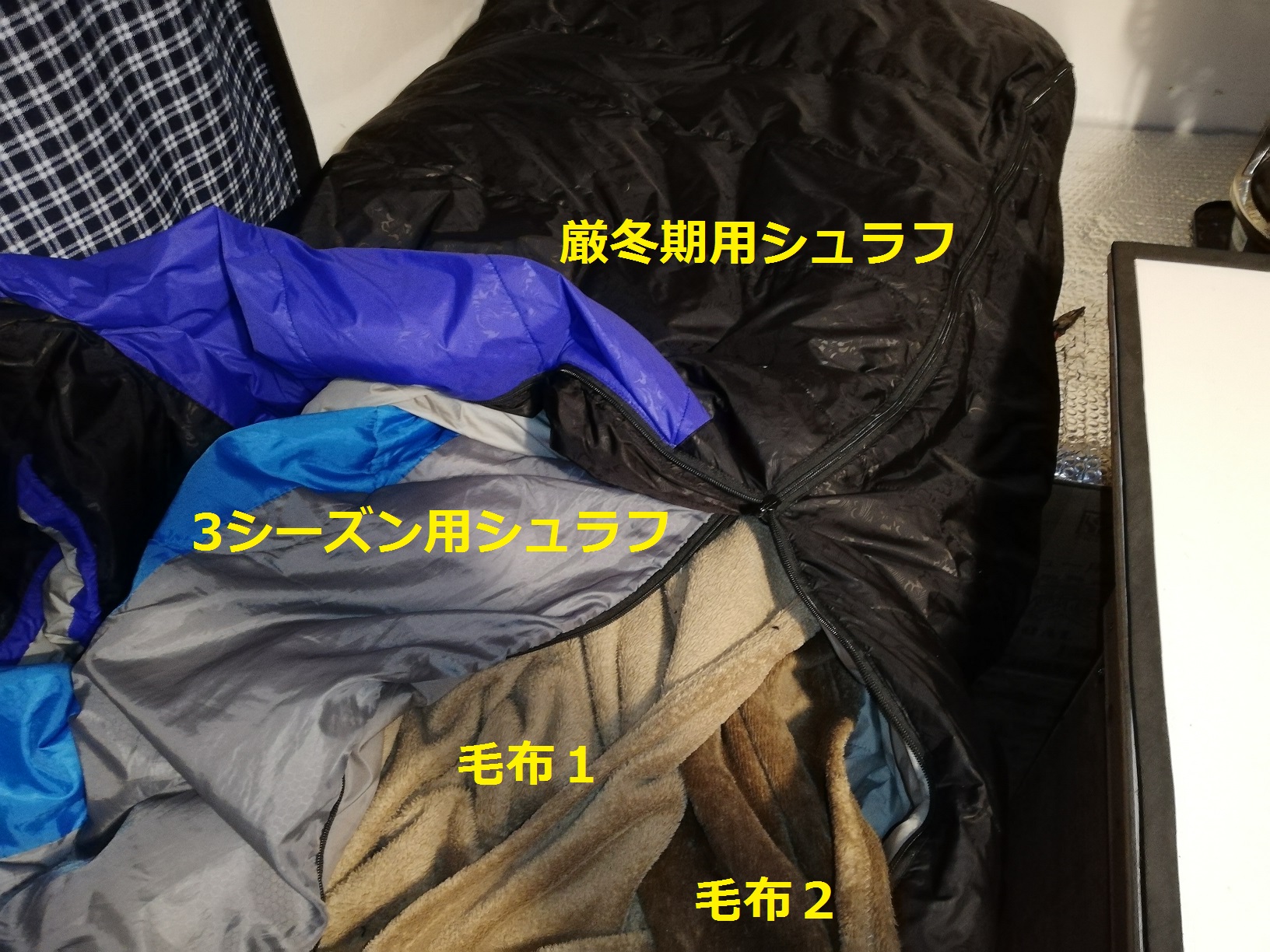 ただし、寝具はいつも通り厳冬期用シュラフの中に3シーズンシュラフと毛布2枚です。