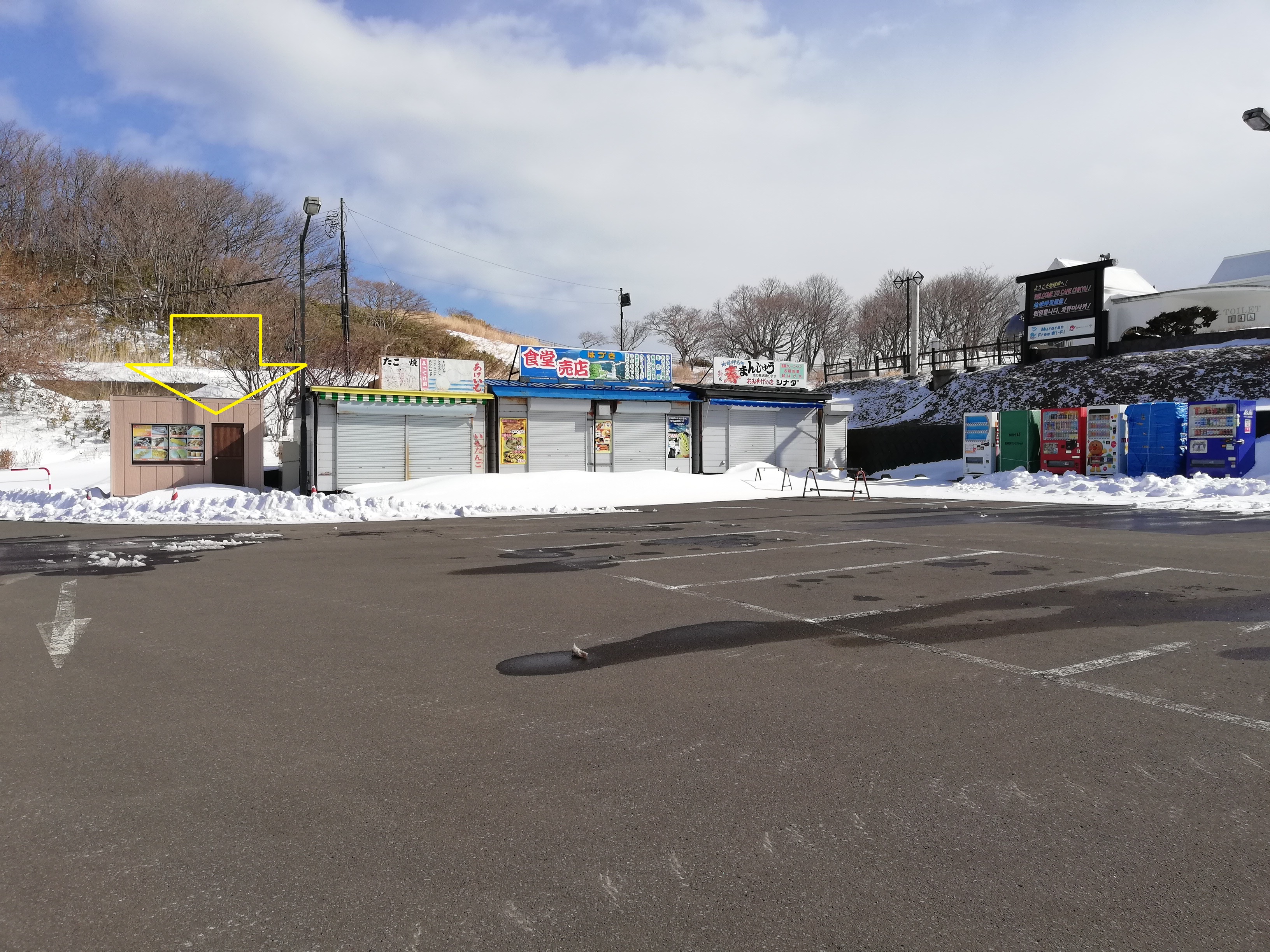 あの今は閉まっているお土産屋さんのあの左の小屋の中です。