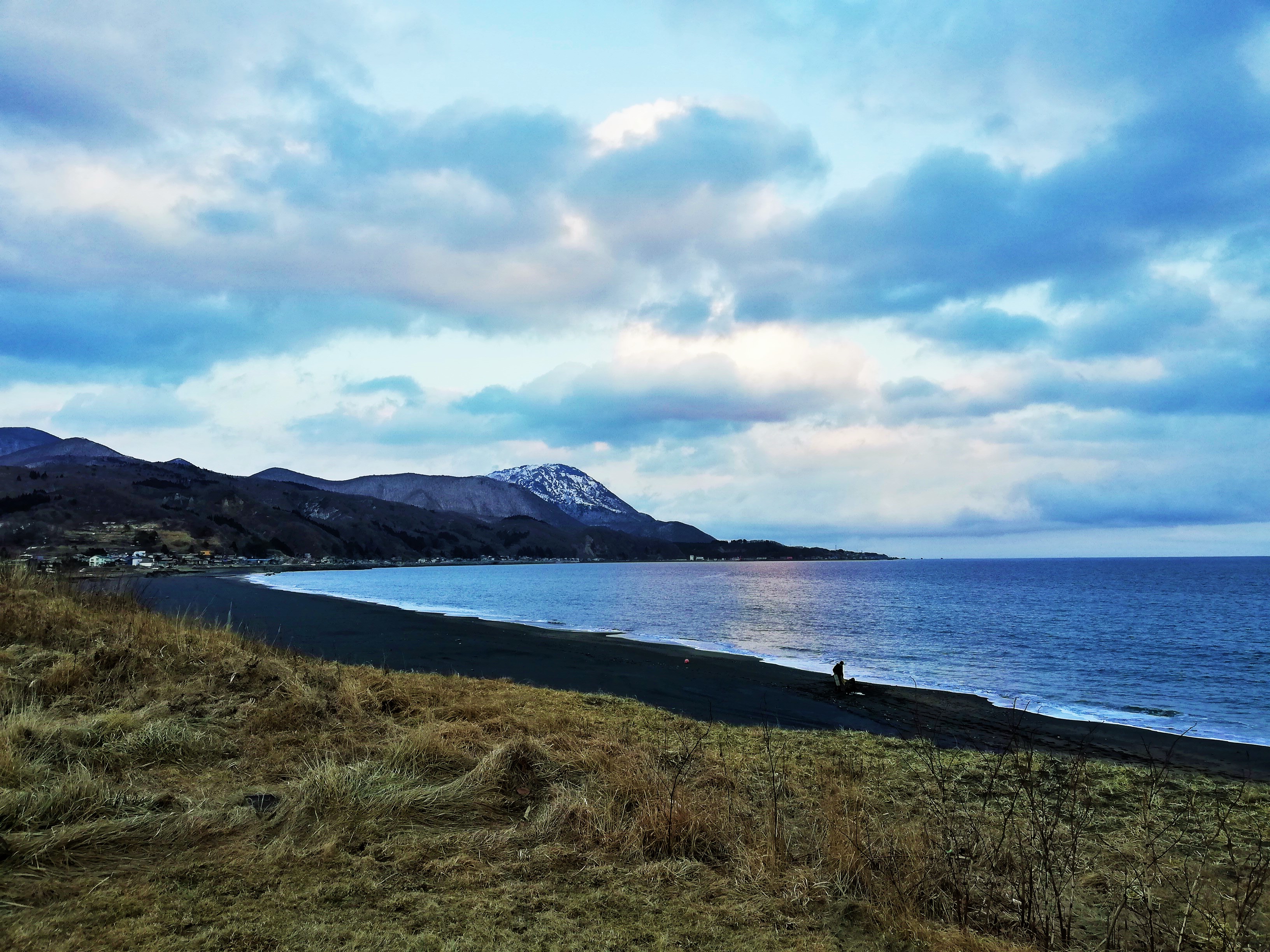 このすぐ後ろには海岸が広がり、冠雪した恵山が見えます。