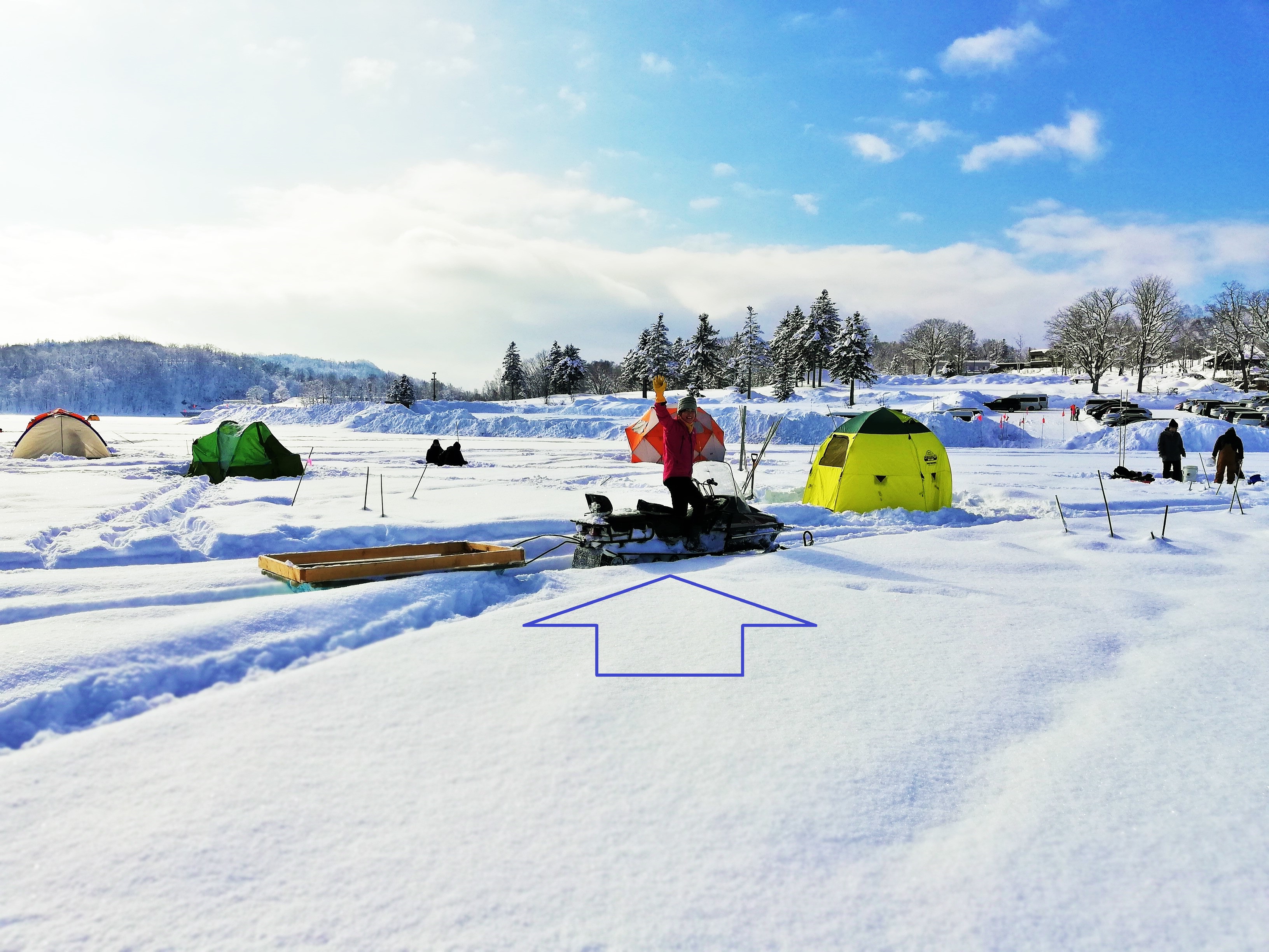 スノーモービルで颯爽と去りゆく朱鞠内子さんを慌てて呼び止めて遠目から