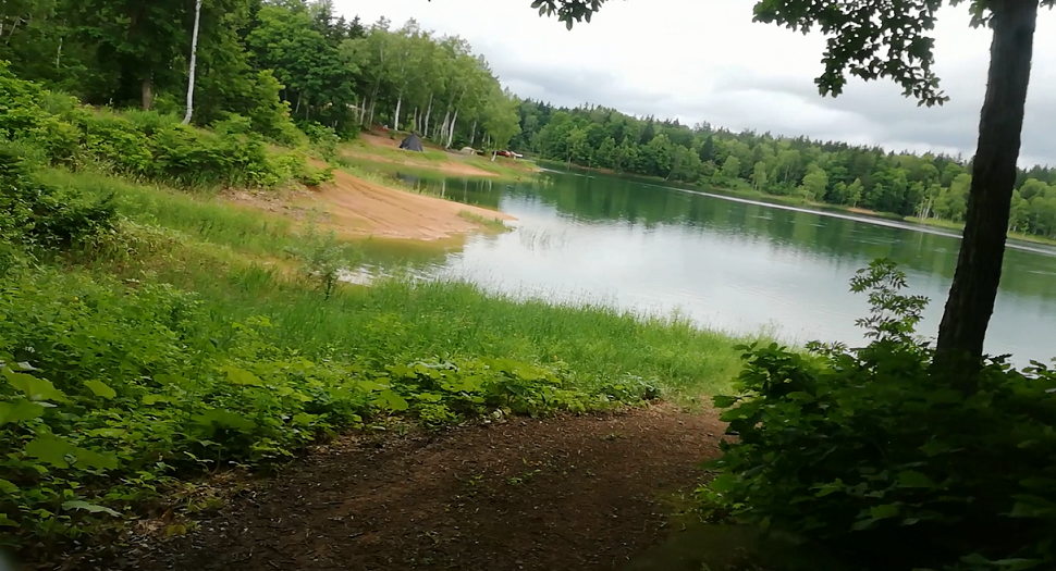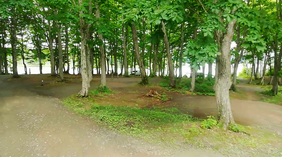 湖畔の森の中を入っていくと、あちこちにキャンパーの姿が見えます。