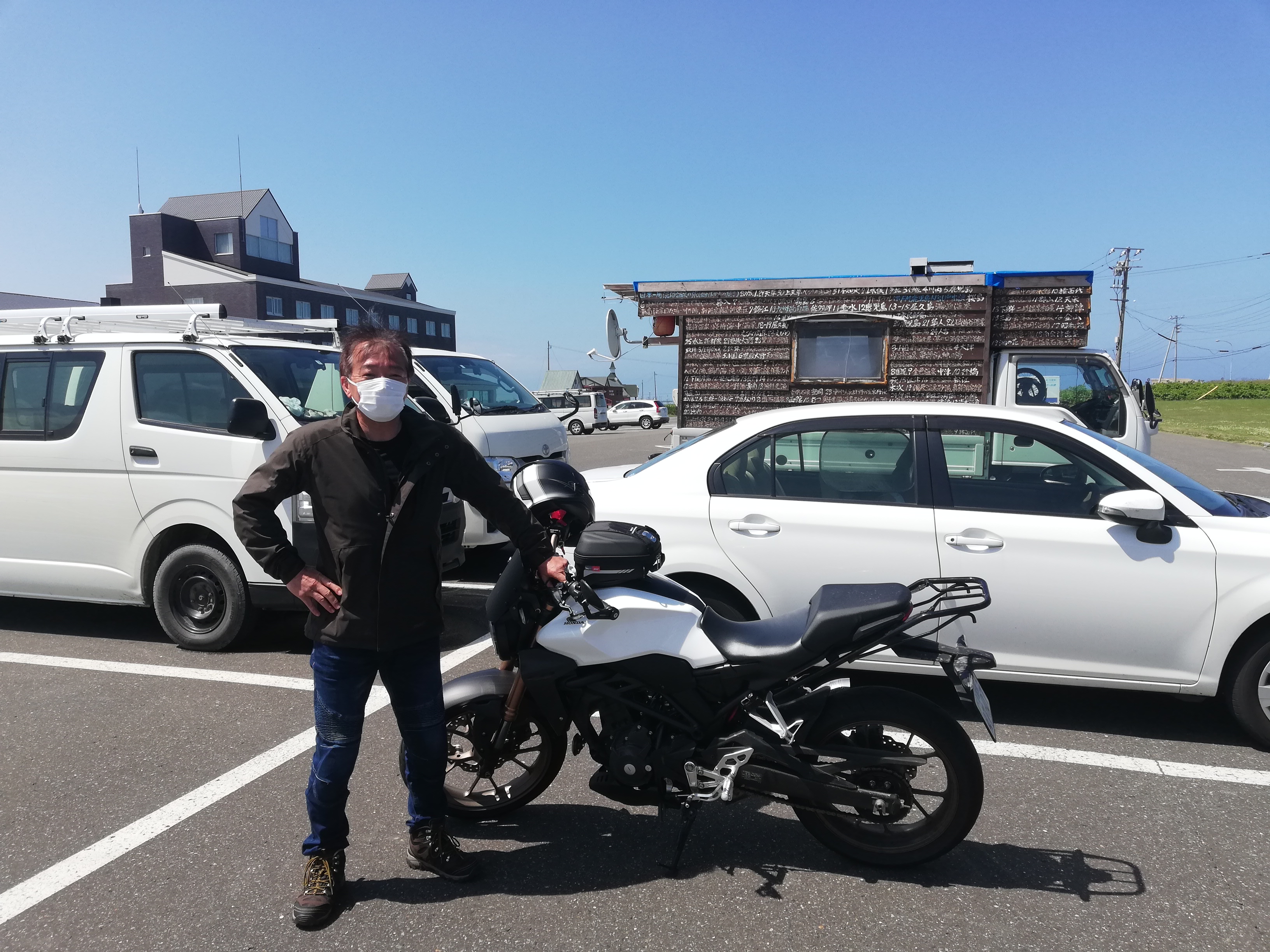 250CCのバイクで広島を出て、名古屋からフェリーで苫小牧に上陸して北海道を周っているそうです。