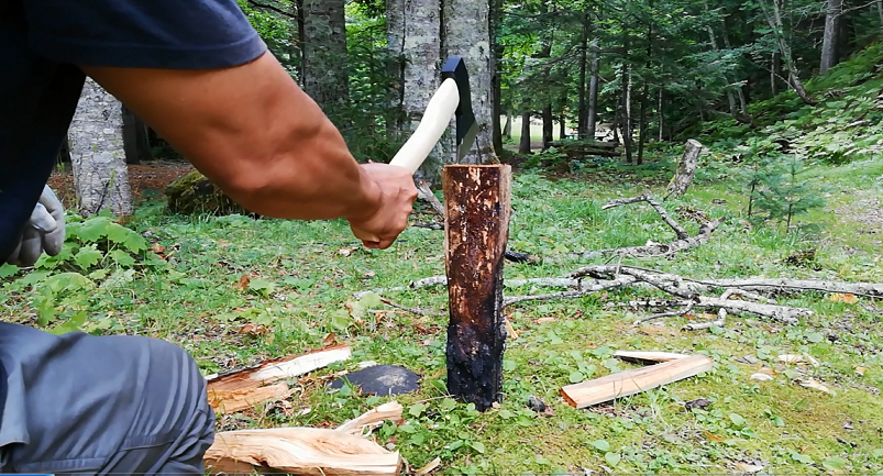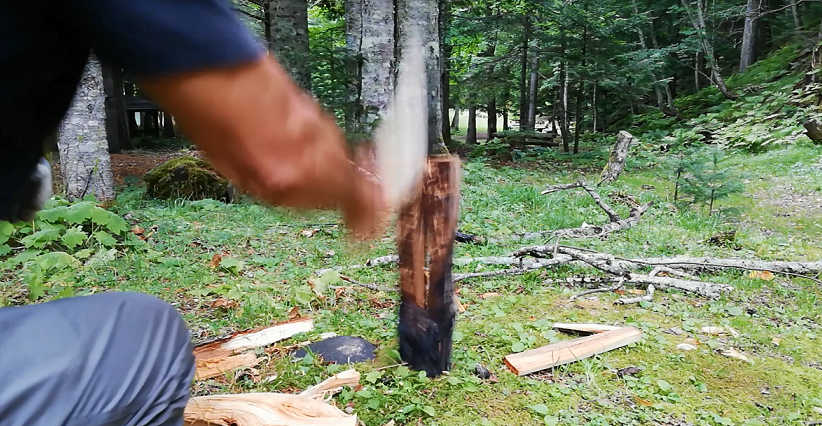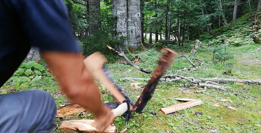 薪を地面に立て、斧を薪の中心にそっと置き