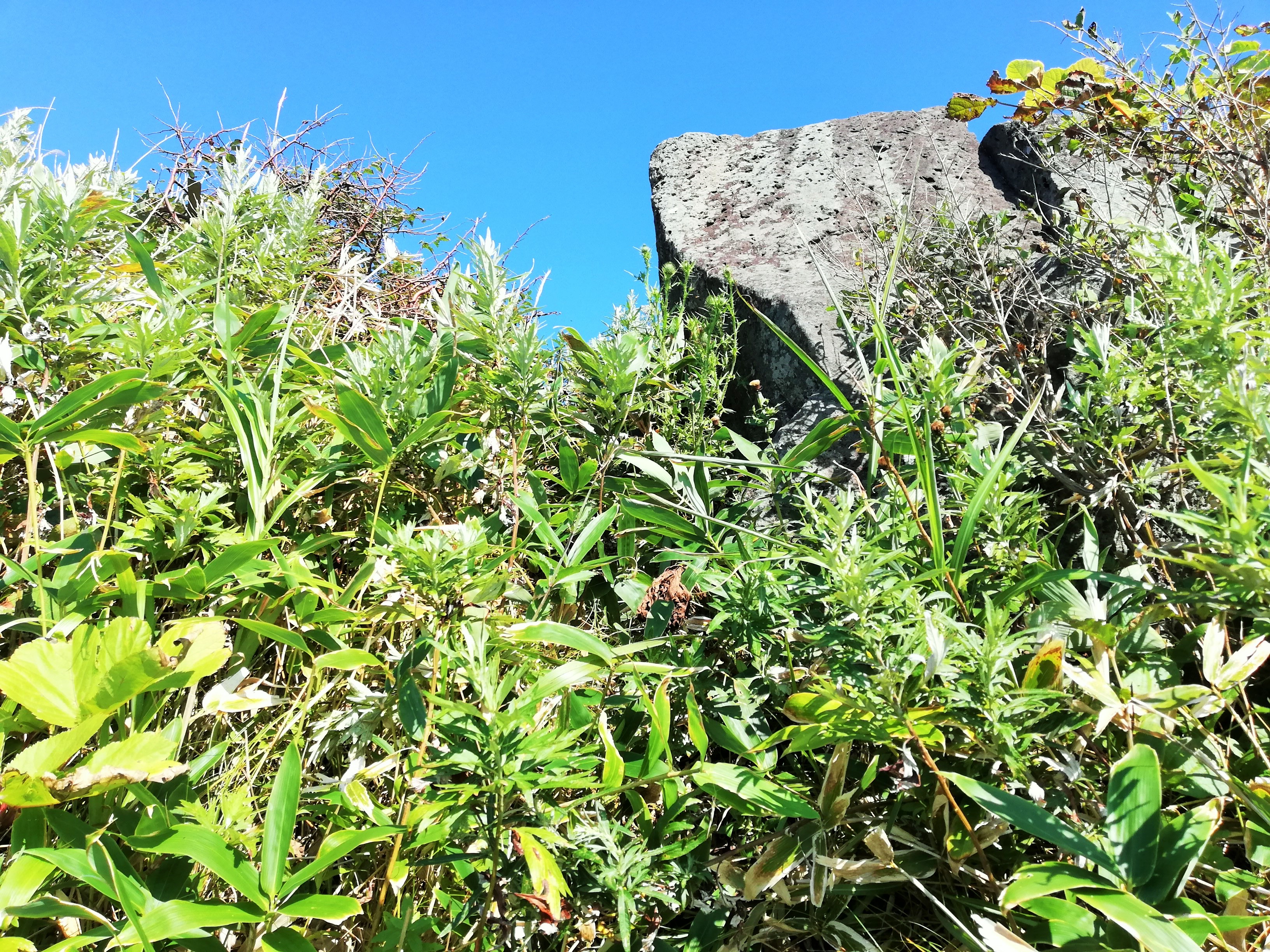 生えてる雑草やクマザサを掴みながら下りていくのですが、草が抜けたらあの岩場に一直線です。