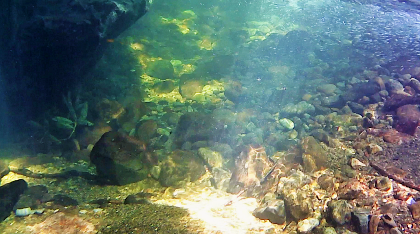 この岩の下を水中カメラで覗いてみると