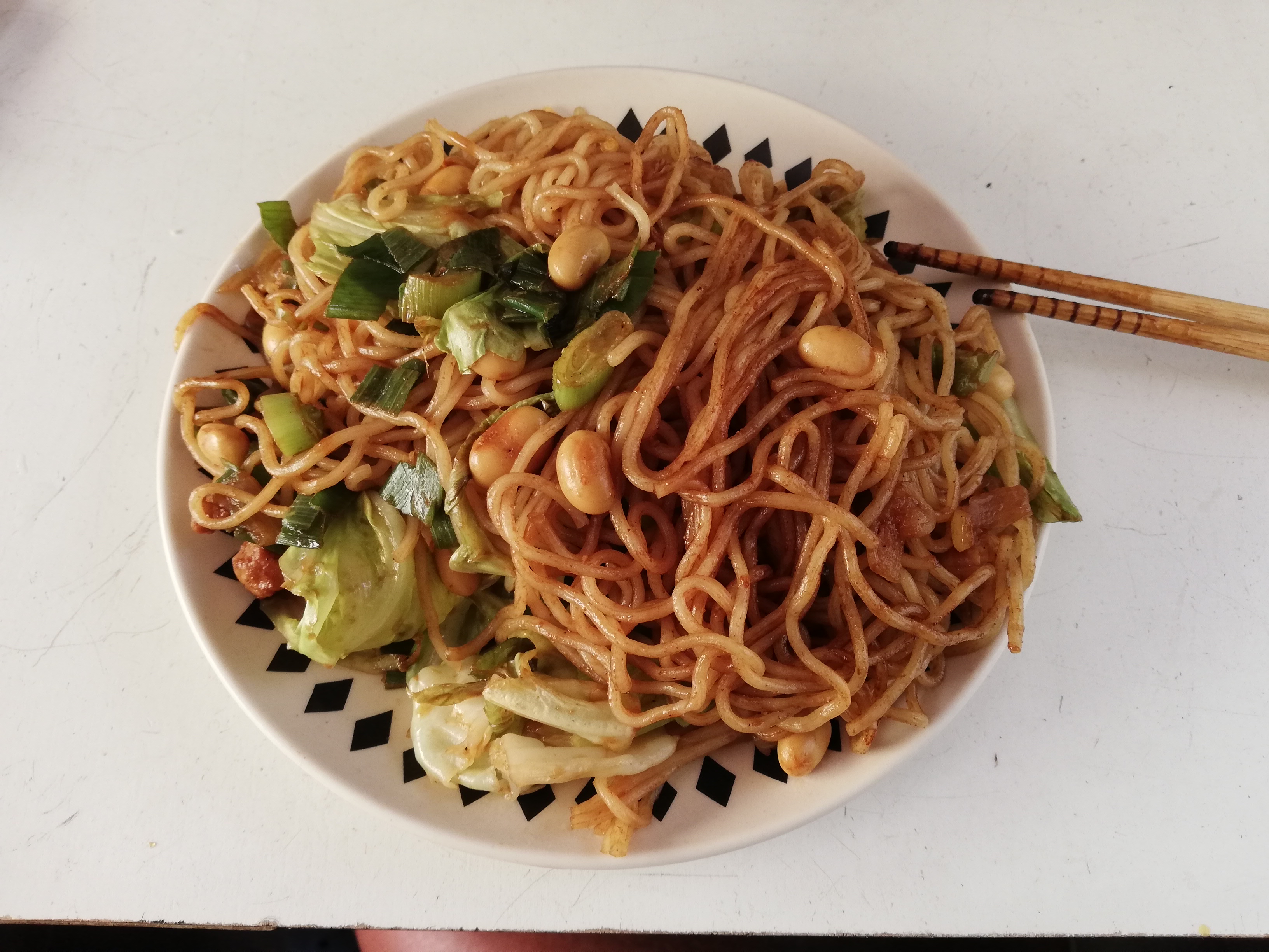 チリビーンズ入り焼きそばを食べ