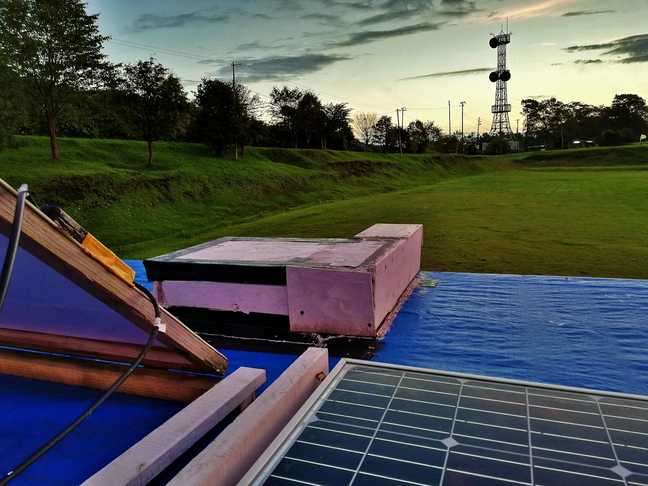 梯子を出して屋根に上り、ソーラーパネルを立てます。