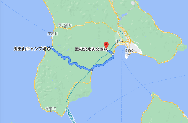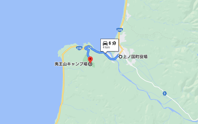 夷王山キャンプ場は、上ノ国町の中心部からはわずか6分。
