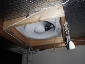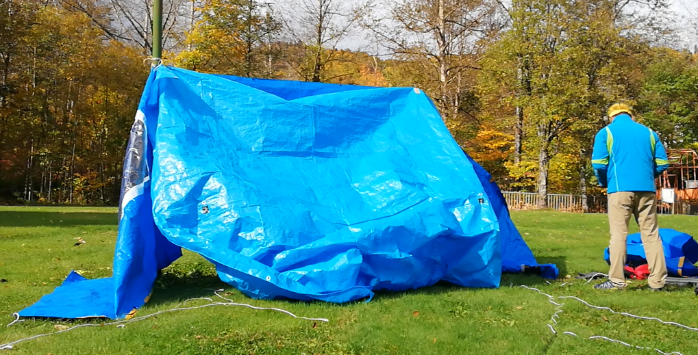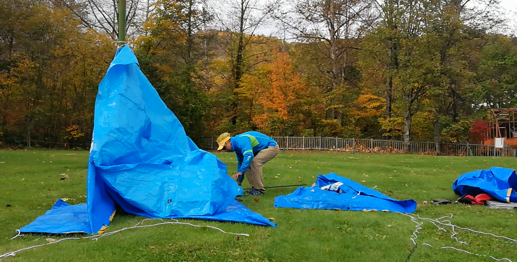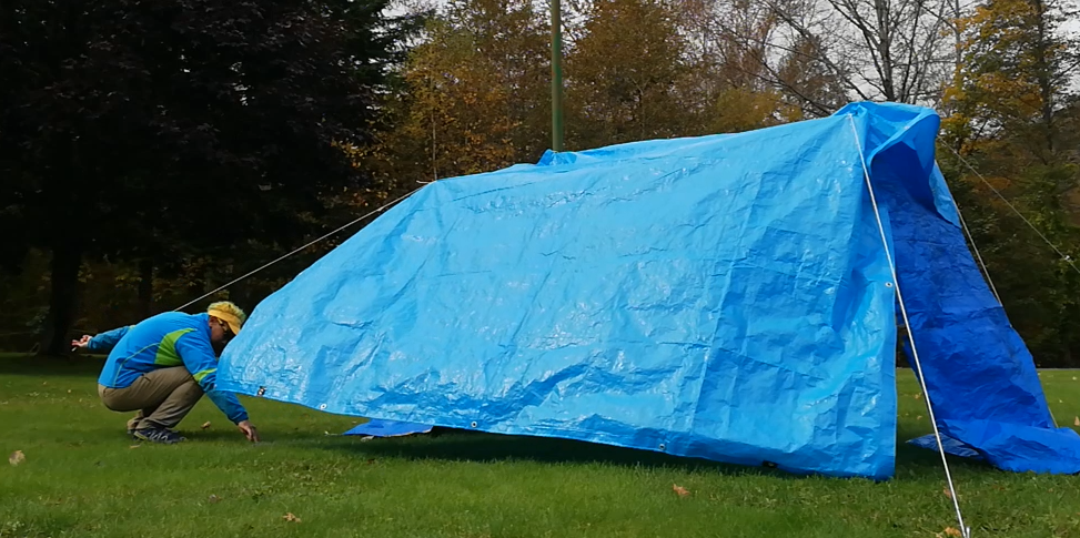 まずは、照明用の柱に3枚のブルーシートの端を括り付け、