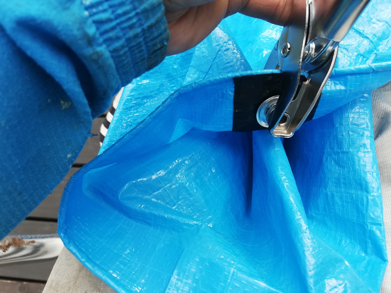 これを作るにあたり、買った時についているブルーシートのハトメではピッチが合わないので、12ミリのハトメをネットで購入しました。
