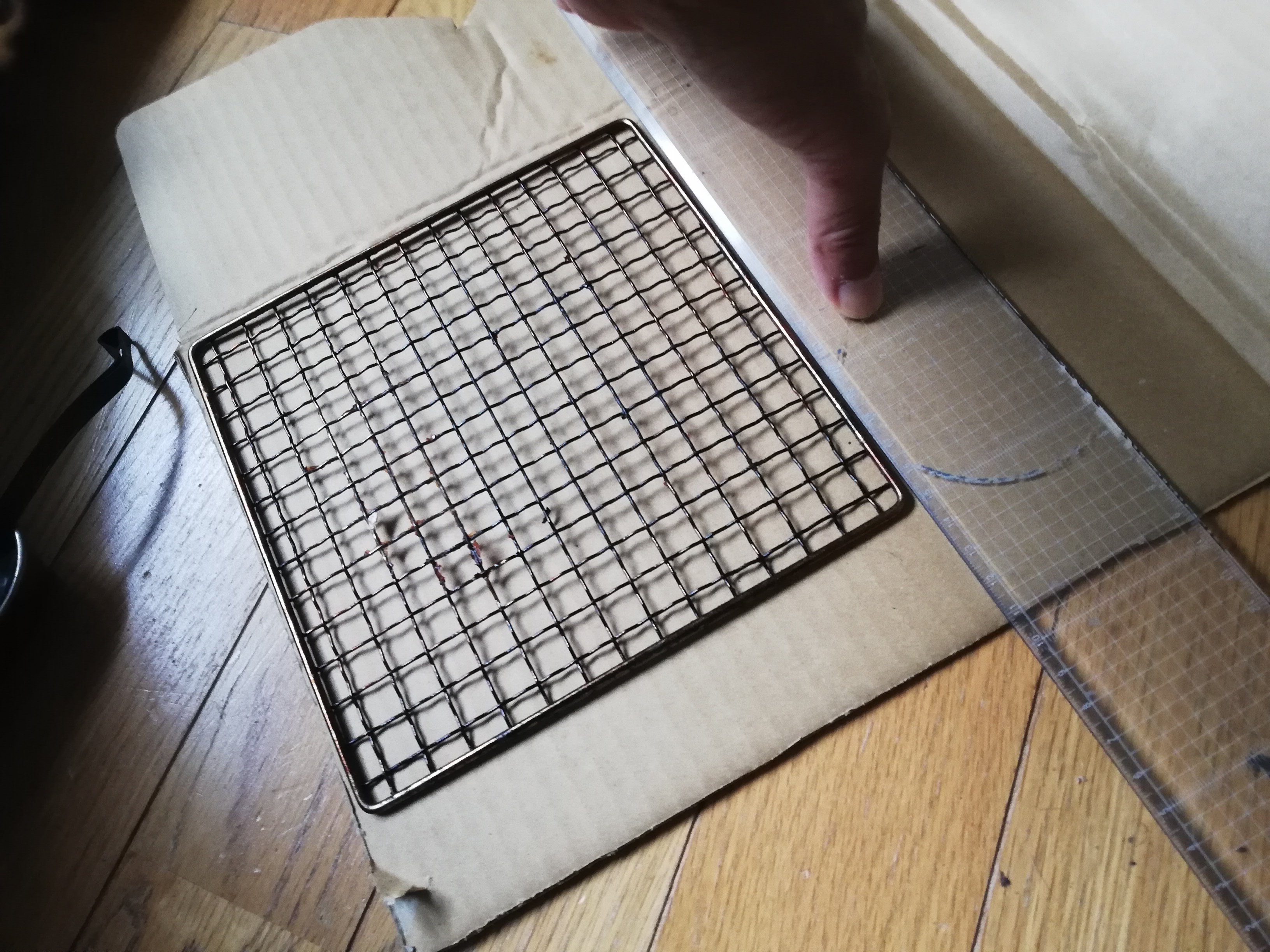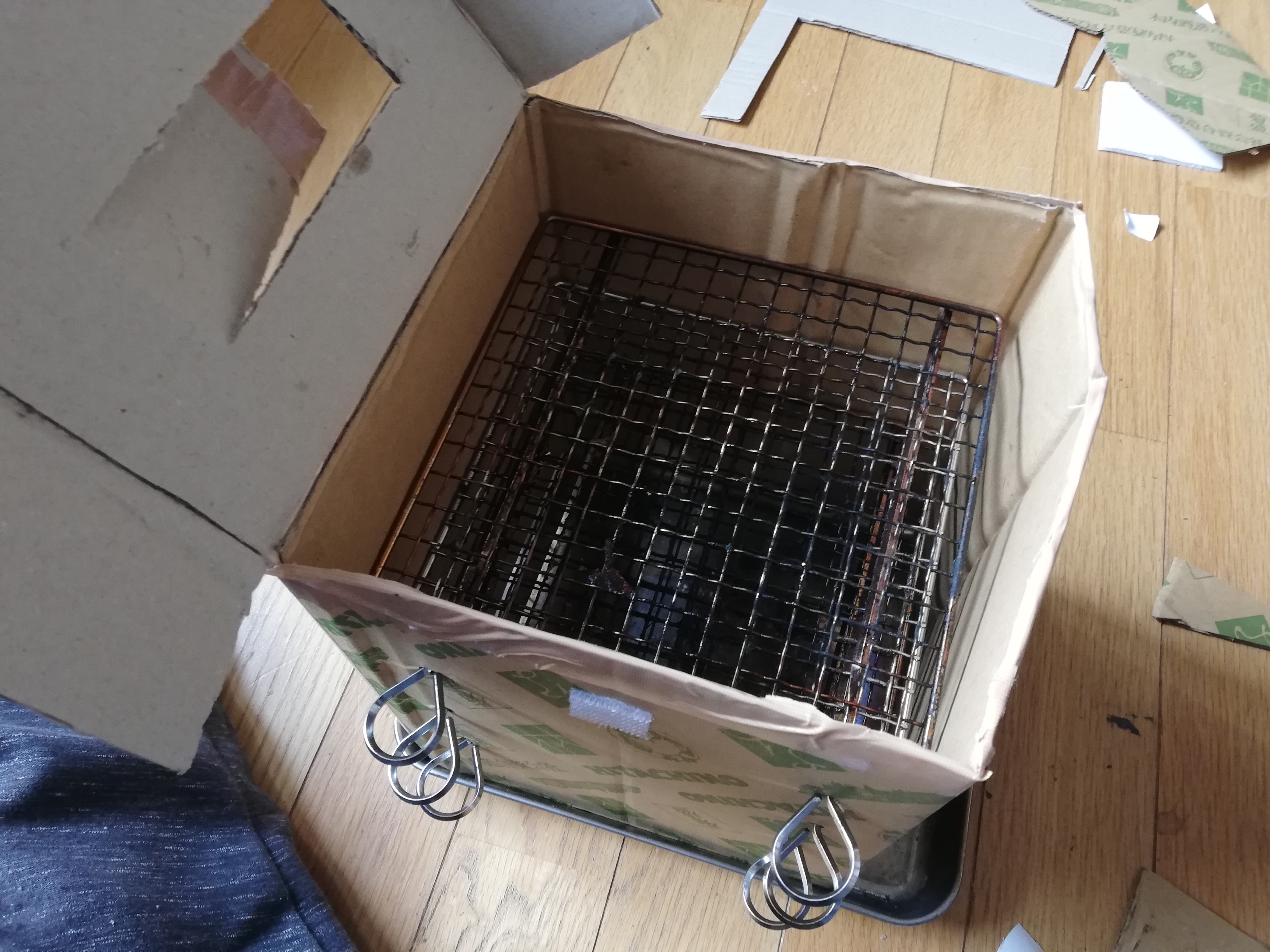 燻製器をトレイの形に合わせて長方形にしたのですが、網との間に隙間があって、食材が下に落ちてしまうことがあるのです。