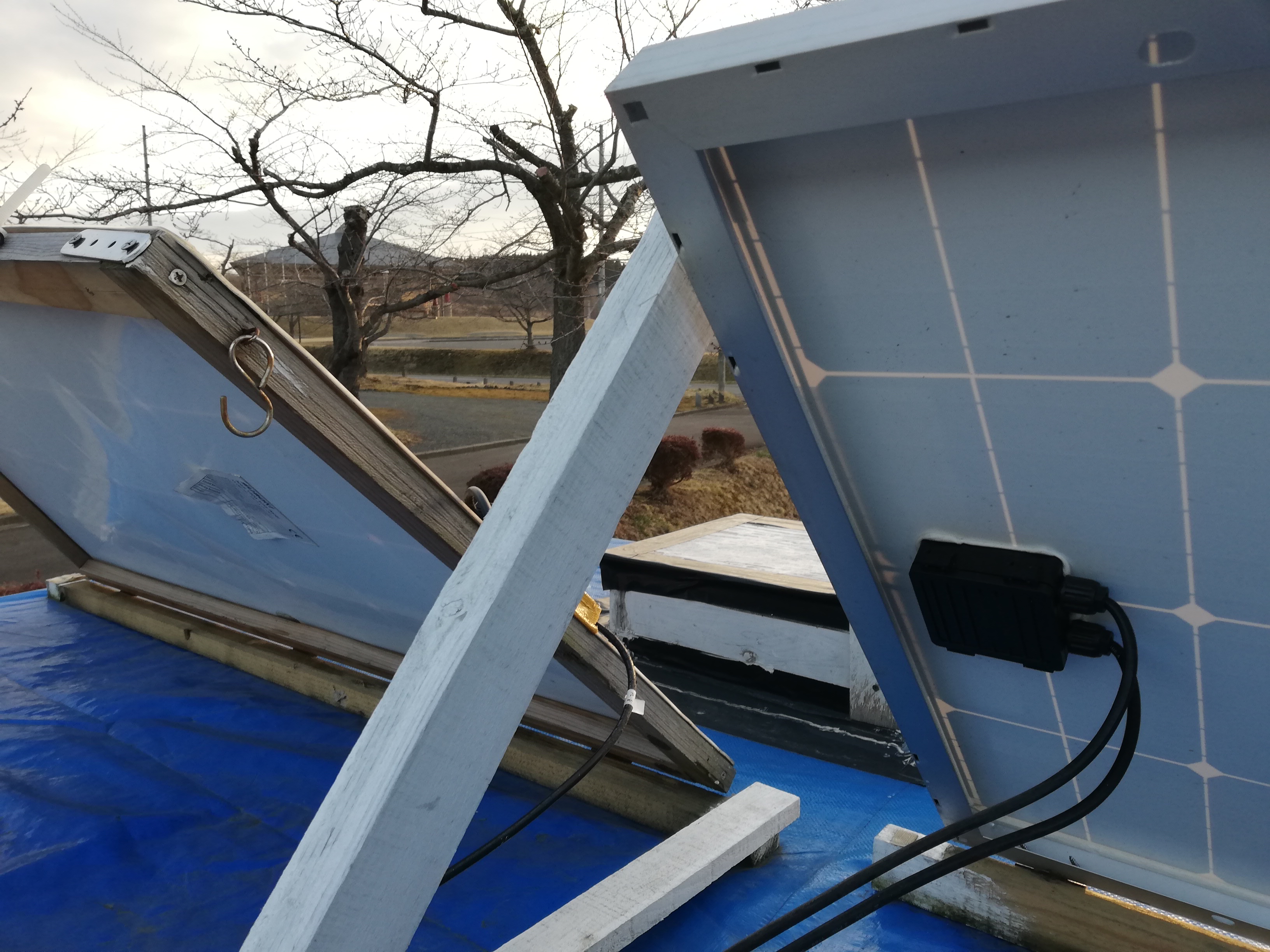 ハシゴを出して屋根に上り、ソーラーを立てます。