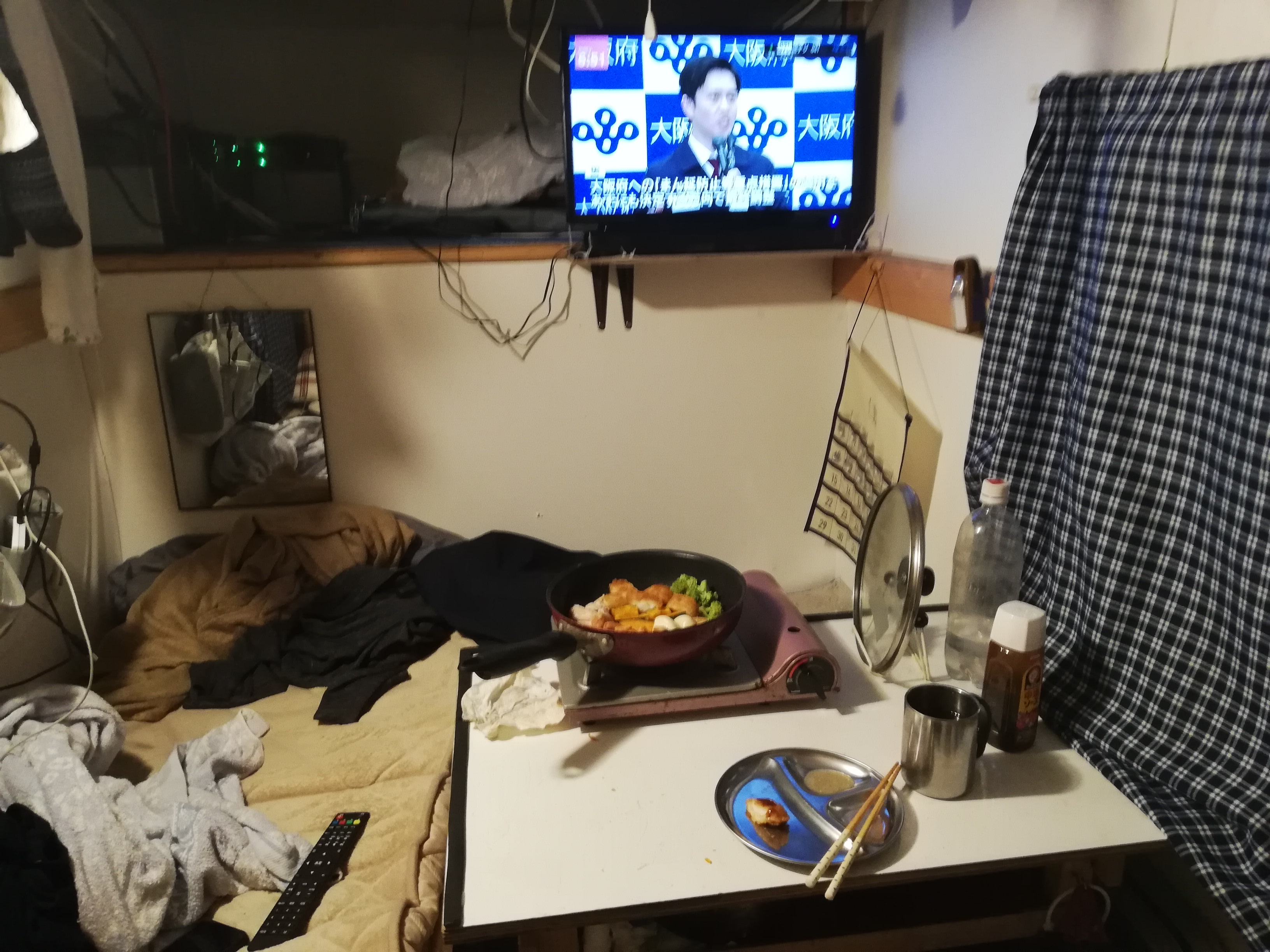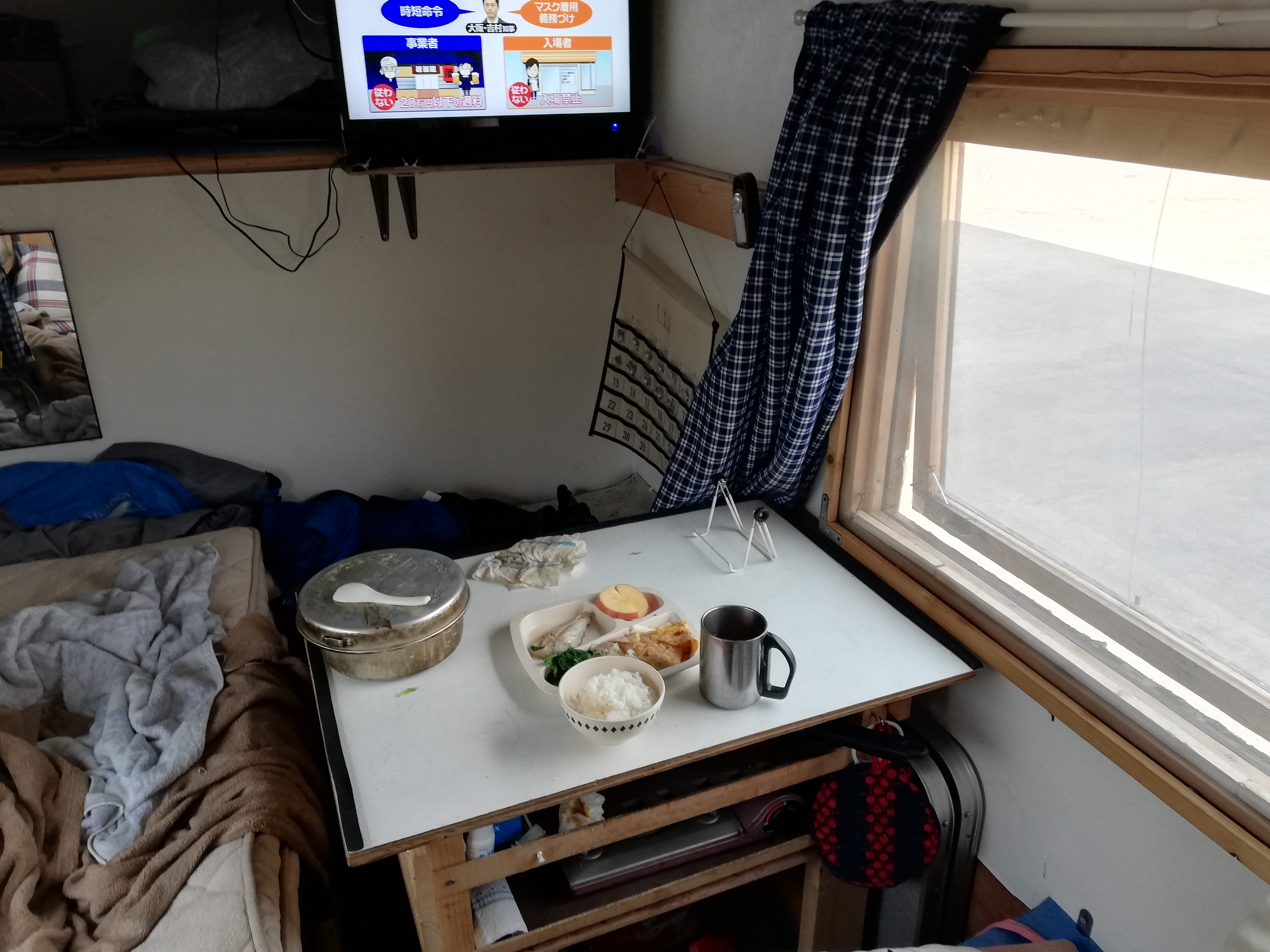 ソーラーを増設し、電気に余裕ができたこともあってテレビを観ながらの夕食です。